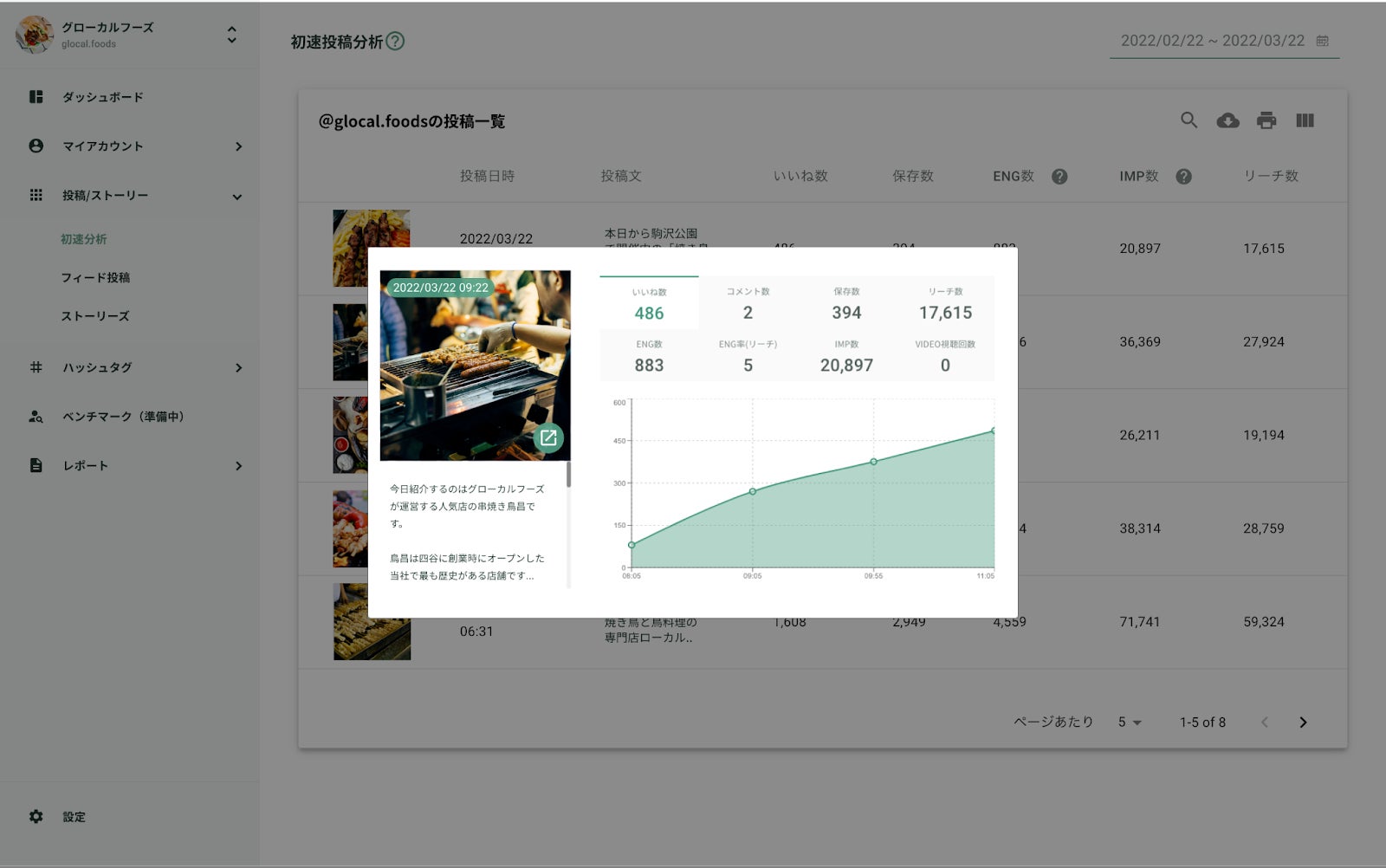 Instagramでは、「短時間にたくさんのエンゲージメント」を獲得することが重要だと言われています。例えば、投稿してから24時間で100いいねがつくのではなく、1時間で100いいねがつくのが重要だと考えられています。その経過を目視でアナログに管理するのは困難なため、投稿の初速推移が計測できる機能を搭載いたしました。