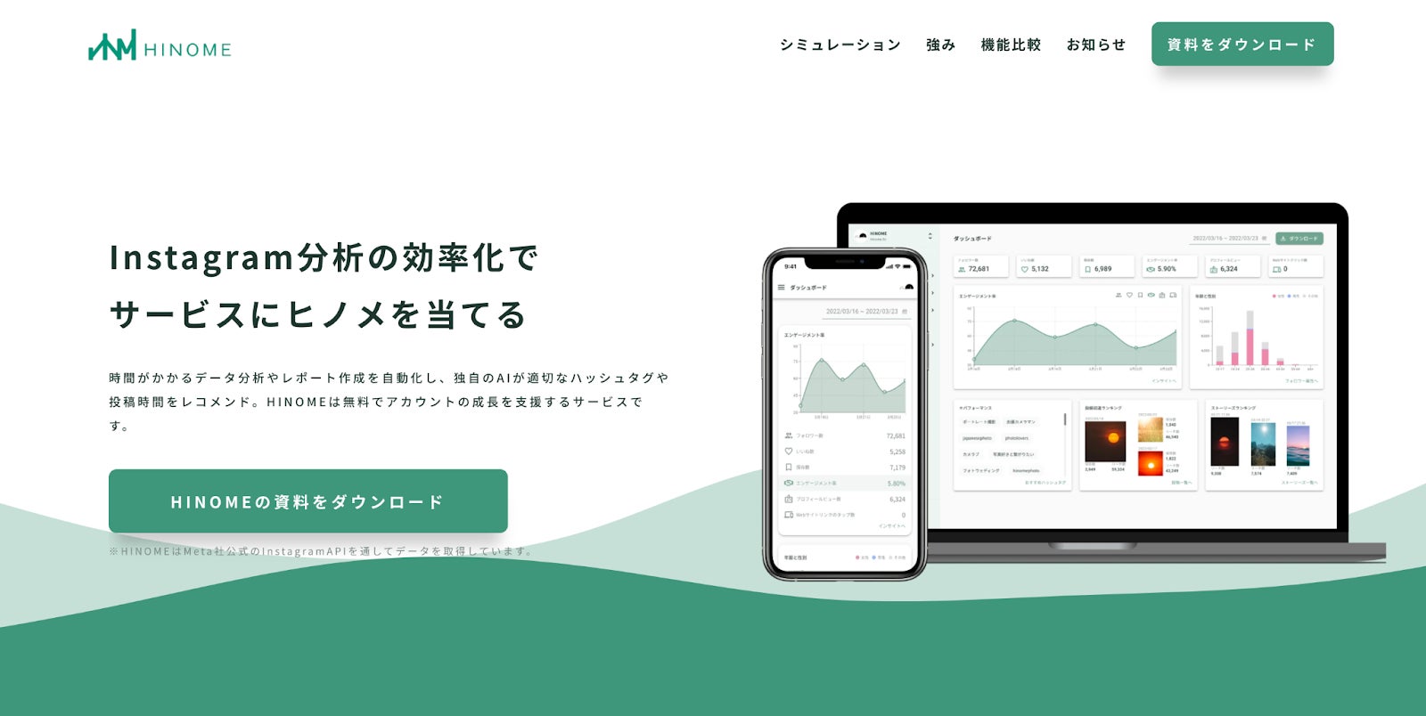 『HINOME』は、完全無料で全ての機能が利用可能なInstagram分析ツールです。基本的なデータの分析はもちろん、Instagram運用で重要だと言われている初速分析と、意外と考えることに時間と手間のかかるハッシュタグのレコメンド機能が搭載されています。さらに、自社の目的に合わせて必要な情報をクリックひとつでレポーティング可能な機能も搭載しています。もちろんセキュリティー面においても、最新の公式InstagramAPIにて開発しているため、安心してお使いいただけます。