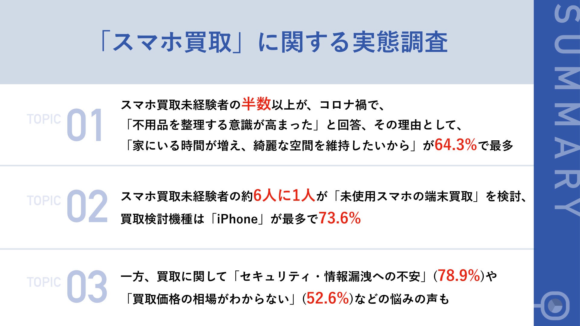 今回の調査では、コロナ禍で家にいる時間が増えたことで、家にある不用品を整理したいと考える人が増えたことが分かりました。中でも、これまでスマホを買取に出したことがない人も、使用していないスマホを「買取」という形で処分を考える傾向にあるようです。ただし、買取時に、スマホの中に残っているデータがちゃんと処理されているのかという情報漏洩の観点での不安、そして、適正買取価格が不明という点から、処分する際に躊躇ってしまうのが実態のようです。コロナ禍で不用品整理の意識が高まるとともに、スマホやパソコンなど、情報処理端末の買取に関する関心は今後もさらに高まることが予想されます。安心が担保されることで、買取サービスの普及が更に進むのではないでしょうか。