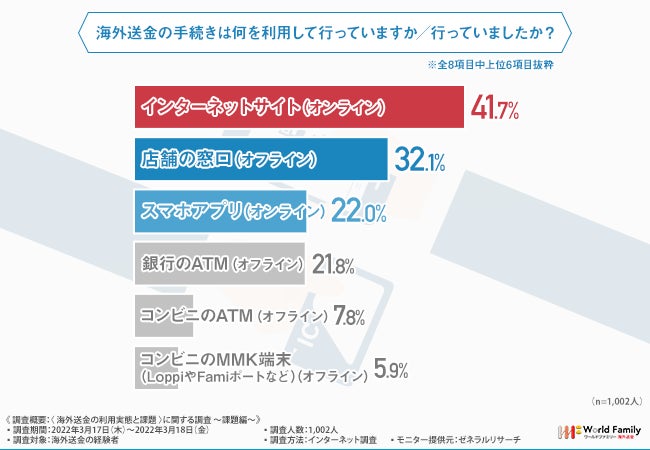 コロナ禍はまだまだ予断を許さない状況が続いていますが、海外送金をする場合、銀行や資金移動業者の店舗、コンビニなどのATMといった、いわゆるオフラインで送金している方と、スマホアプリなどオンラインで完結している方のどちらが多いのでしょうか。