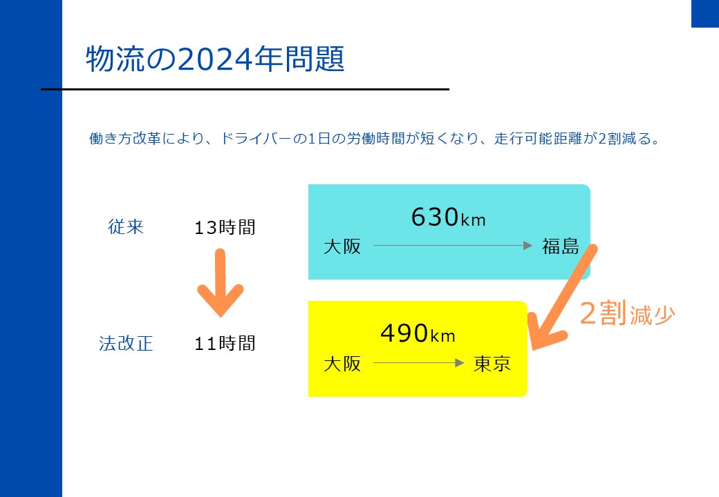 「物流の2024年問題」とは、働き方改革関連法によって、2024 年4月1日以降、「自動車運転の業務」に対し、年間の時間外労働時間の上限が960時間に制限されることでドライバーの運転時間が短くなります。よって、ドライバー一日の走行距離も短くなり、中継輸送といった方式が必要になってきます。