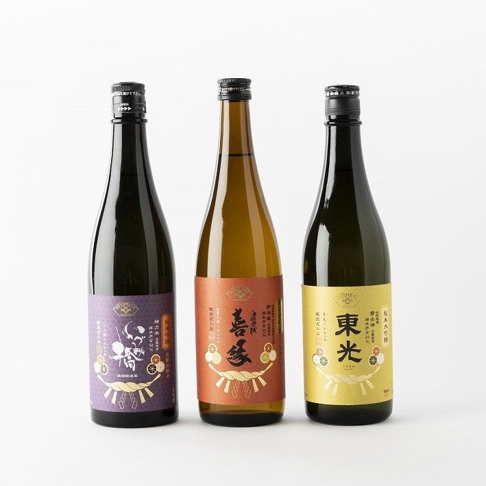 華やかさと上品さを併せ持つ純米大吟醸、山形県「雪女神 東光」、爽快で滑らか、他にはない野性味を堪能できる純米吟醸、兵庫県「白鷺の城 喜縁」、すっきりとしたキレのある飲み口の純米吟醸、神奈川県「神力米 いづみ橋」。720mlの飲みきりサイズ。