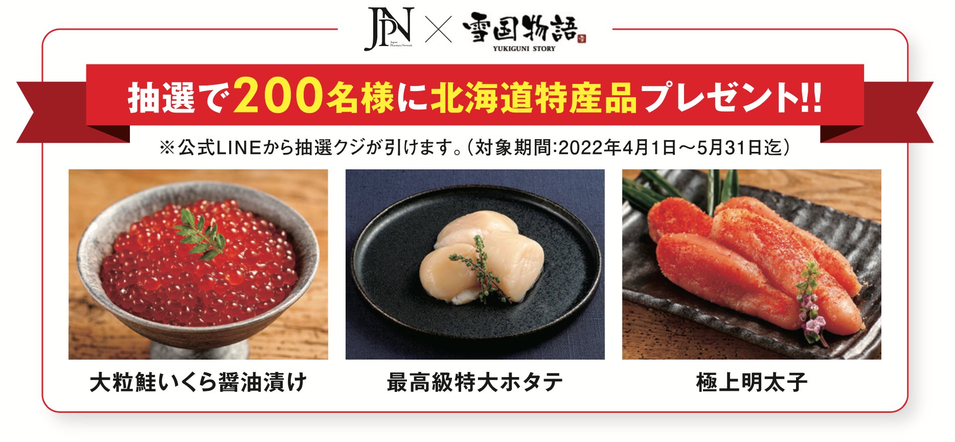 この度、JPN正式ローンチに際し、LINEのお友達登録頂いた方全員に【割引クーポン】をお送りいたします。さらにWチャンスとして、抽選で200名の方に【北海道海の幸】をプレゼントいたします。