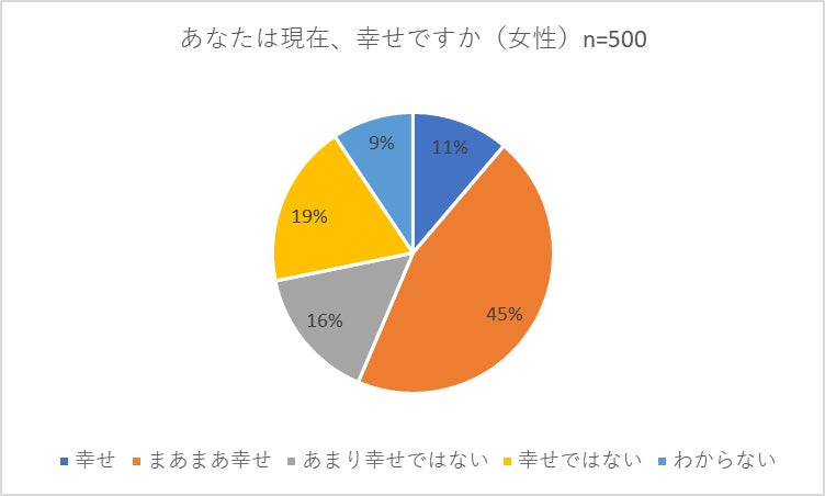 Ueda Keisho Corp.では1000人(男女各500人)に対して「あなたは現在、幸せですか」と質問したところ、「まあまあ幸せ」が41パーセントで最多となりました。「幸せ」と「まあまあ幸せ」を合わせた割合は51パーセントなり、「あまり幸せではない」と「幸せではない」の合計40パーセントを上回りました。