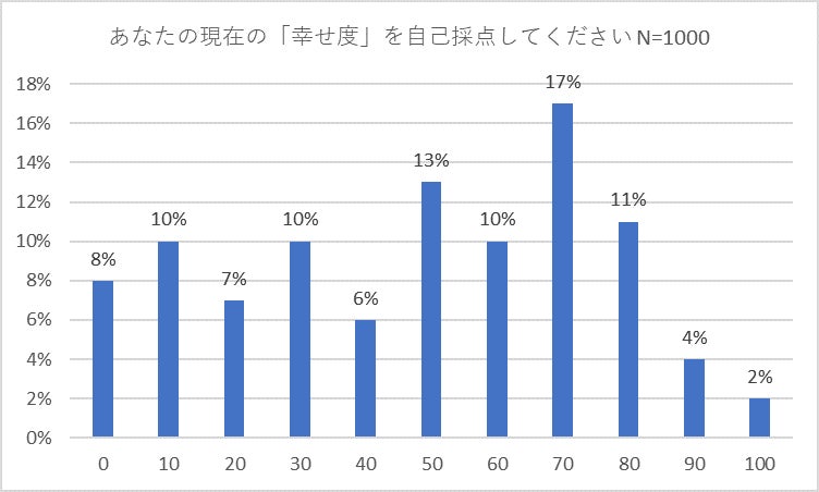 「幸せ度」の自己採点は70点が最多、平均は48点(男性45点、女性50点)