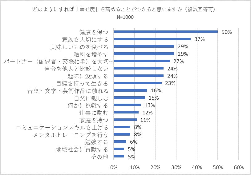 「どのようにすれば『幸せ度』を高めることができると思いますか」(複数回答可)との質問では「健康を保つ」が50パーセントで最多。以下「家族を大切にする」(37パーセント)、「美味しいものを食べる」、「給料を増やす」(ともに29パーセント)が続きました。男女別ではトップ2が同じでしたが、「美味しものを食べる」では女性が38パーセントで3位、男性は21パーセントの7位と差が出ました。また、「自分と他人を比較しない」については女性が30パーセントで4位、男性は18パーセントで8位と違いが出ました。