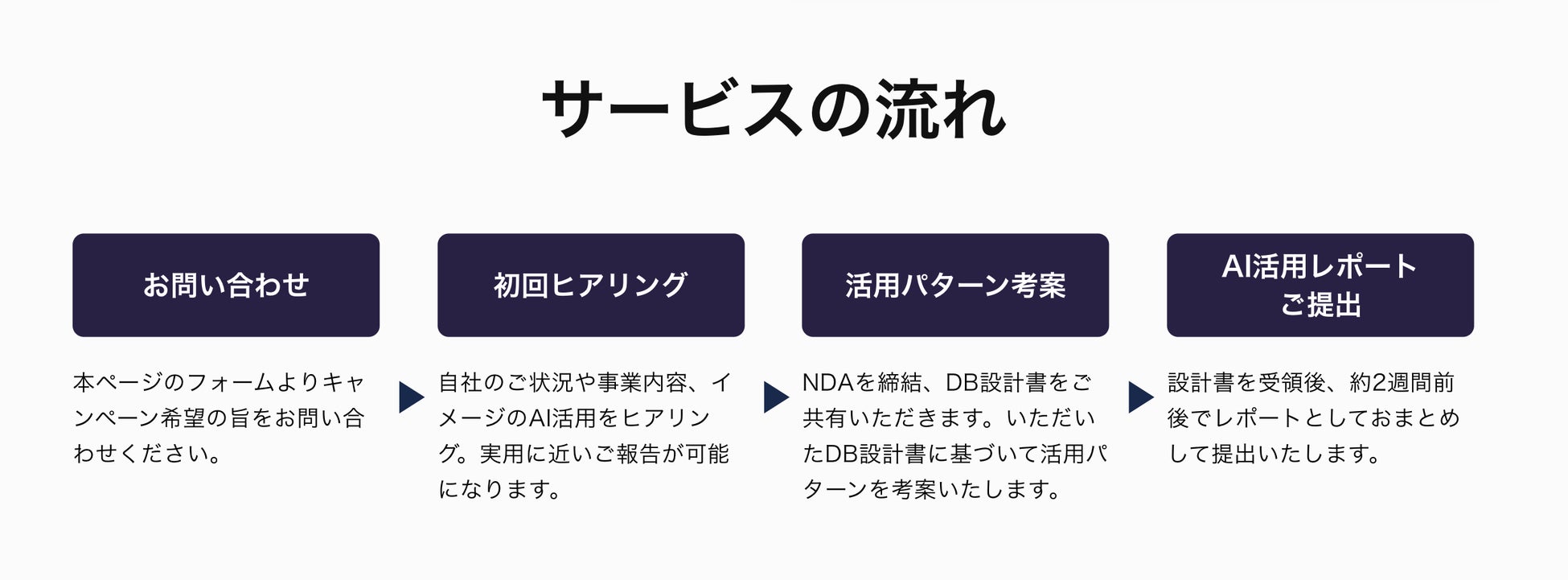 自社で運用されているデータベースの設計書から活用が想定できるAIのご提案をレポートとしてご提出いたします。レポートはそのまま「AIの実証実験(PoC)」に進むための資料や、今後の業務改善/データ整備などの観点で親くだていただけます。