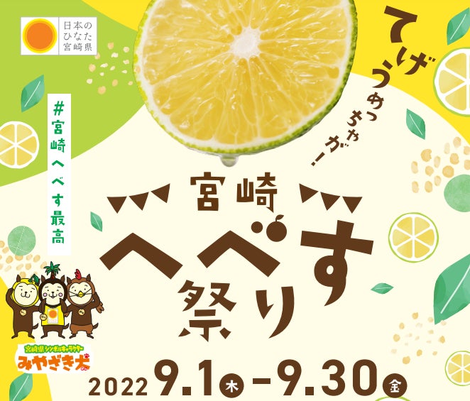 関西圏にお住まいのみなさまへ宮崎県の魅力を伝える宮崎県大阪事務所(所在:大阪府大阪市)は、大阪府、京都府、兵庫県の宮崎ゆかりの飲食店において9月1日(木)より1か月間、「宮崎へべす祭り」を開催いたします。また、最高ランクの和牛「宮崎牛」のセットや宮崎県産品の詰め合わせセットが当たるインスタグラムハッシュタグキャンペーン「#宮崎へべす最高」を同時開催いたします。