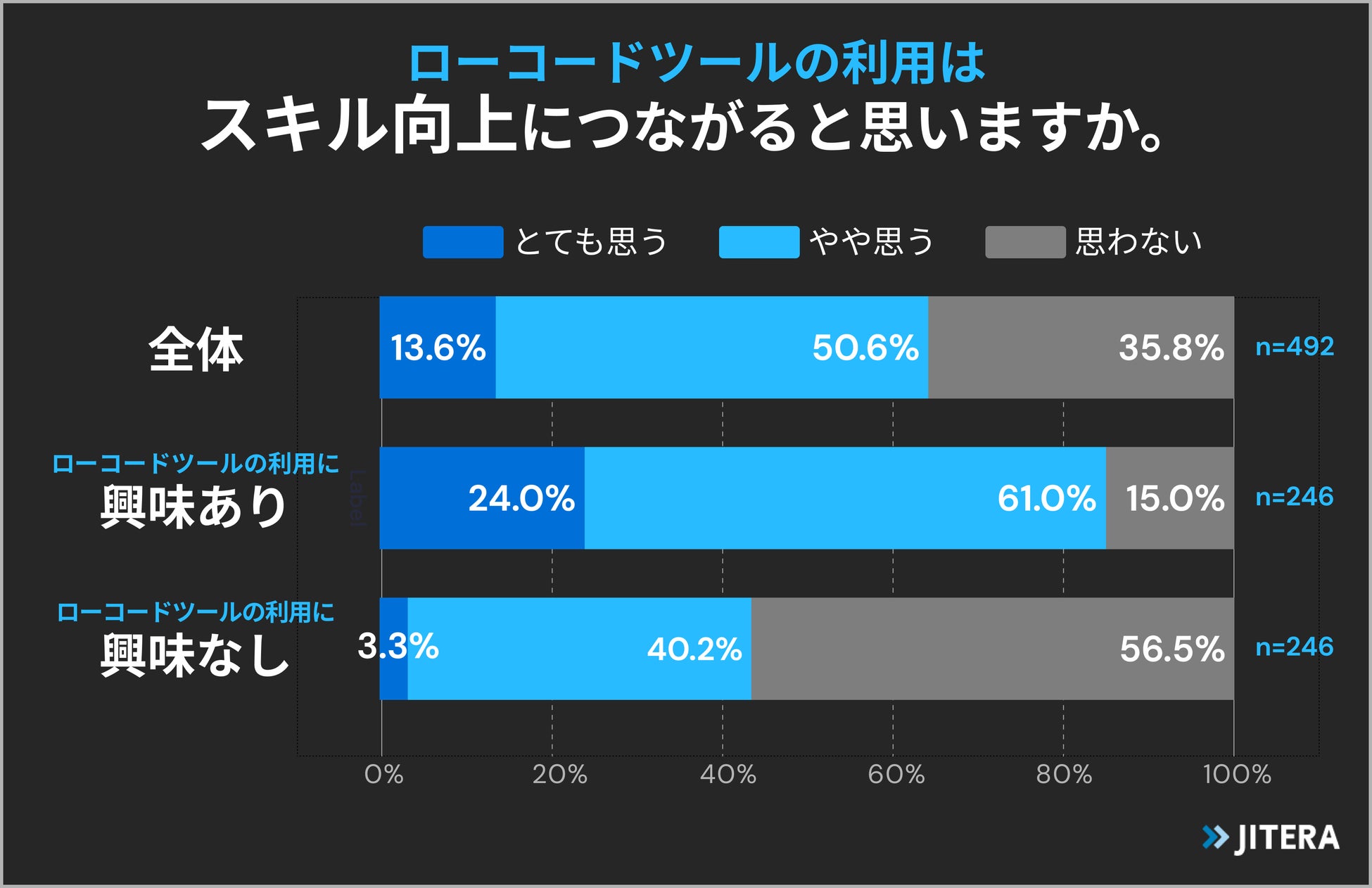 ローコードツールの利用はスキル向上につながると思うか尋ねたところ、6割以上がスキル向上につながると回答しました。また、ローコードツールに興味がある方の8割以上が、ローコードツールがスキル向上に繋がると考えていることがわかりました(n=492)。