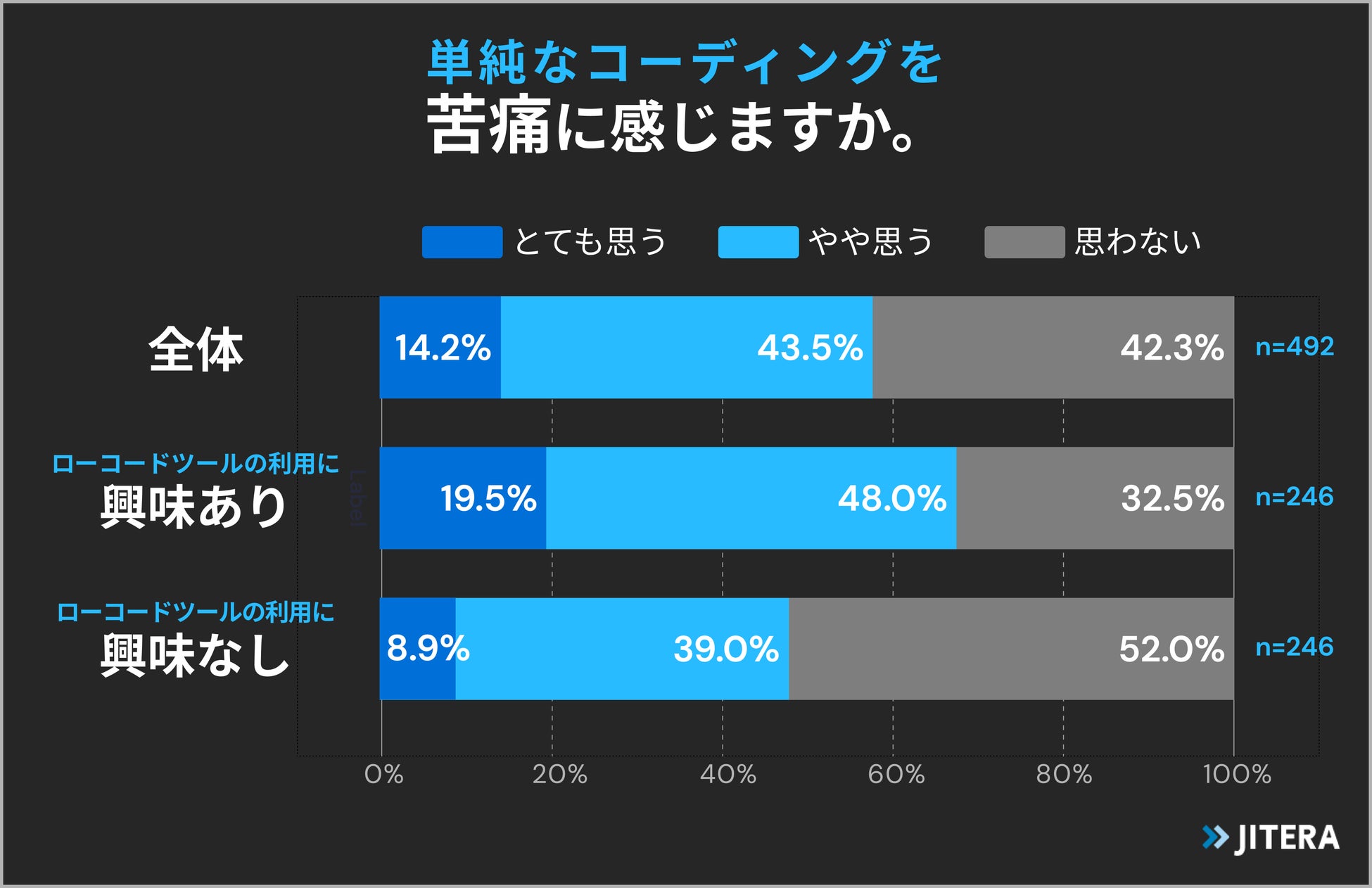 単純なコーディングを苦痛に感じるか尋ねたところ、「とても思う」と「やや思う」が合わせて57.7%と、約6割が単純なコーディングに苦痛を感じていると回答しました。また、ローコードツールに興味がある方は約7割と、より苦痛を感じていることがわかりました(n=492)。