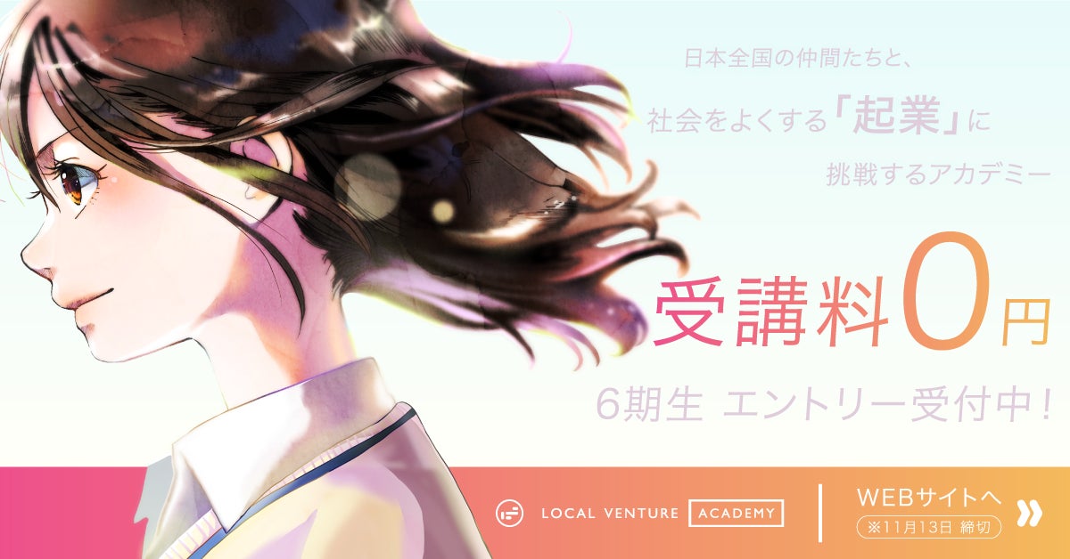 株式会社ローカルベンチャーグループ(本社:福岡県福岡市、代表取締役:富田安則)は、ゼロからの起業はもちろんのこと、会社員を続けながらの副業起業やフリーランスからの法人化など、起業を目指す全ての方を対象とした「ローカルベンチャーアカデミー」をリニューアルし、第6期生の募集を開始いたしました。起業数の最大化を通じた地域経済へのインパクトを目指すため、「6期生の受講料は無料」。4ヶ月間の集中プログラムを通じ、創業融資を得て事業推進できるレベルの事業計画策定を行います。累計150名以上がこのプログラムを修了し、多くの事業・企業が誕生し、様々な地域でビジネスAward等を受賞しています。