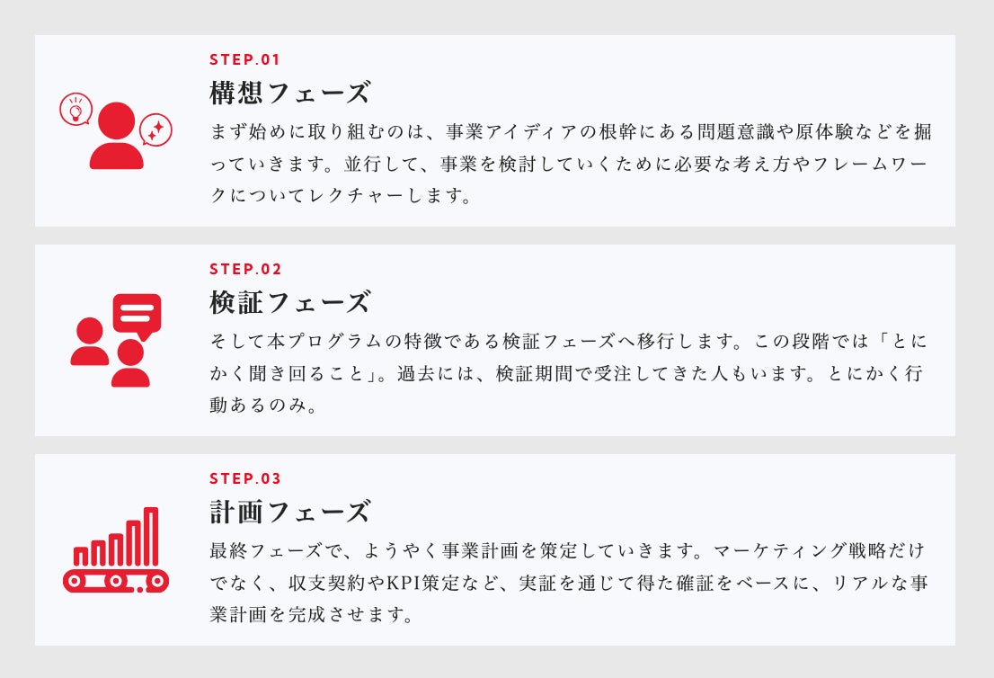 4ヶ月で「事業モデルを構想」して、「実証テスト」を行い、「事業計画策定する」一気通貫のプログラム。講師はリクルート出身の経験豊富なメンバー