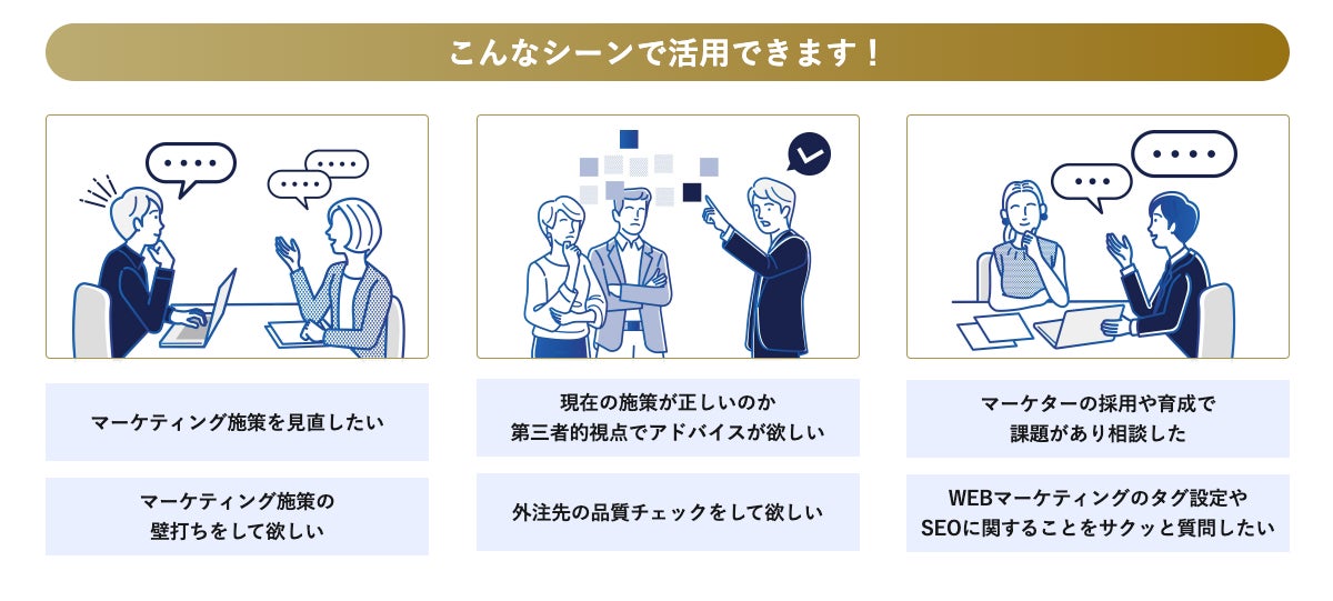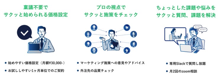 コンサルティングに依頼したり、新しく採用するほどではないが、「プロに聞きたいことが沢山ある」といった悩みを抱えている企業様には、月額3万円でお試しいただくことで、人材確保のリソースを軽減しながら、マーケティングに関する悩みを解決することができます。