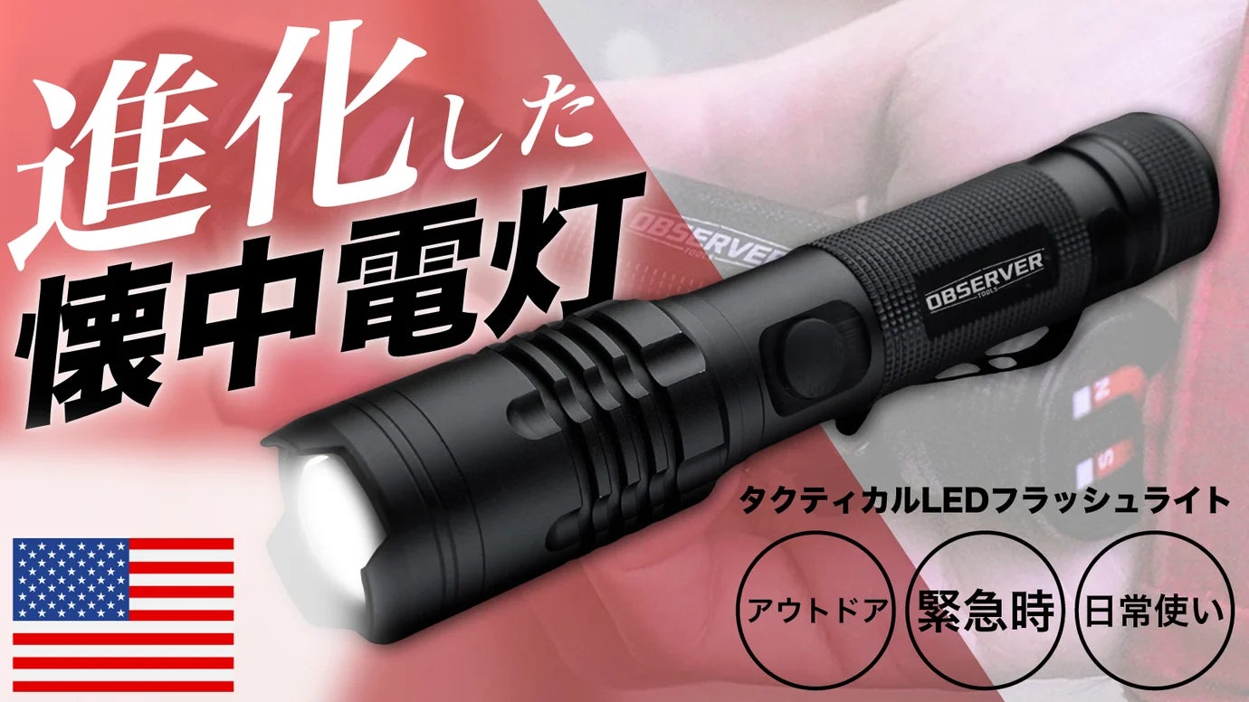 「OBSERVER TOOLS」タクティカルLEDフラッシュライトは災害の多い日本で重宝する商品であると思います。災害時には、通常の充電器が使えなくなる可能性があるため、急な停電などでも単四電池で使用できるパワーバンク内蔵の懐中電灯はスマートフォンやタブレットなどの電子機器を充電できることはとても重要な事です。