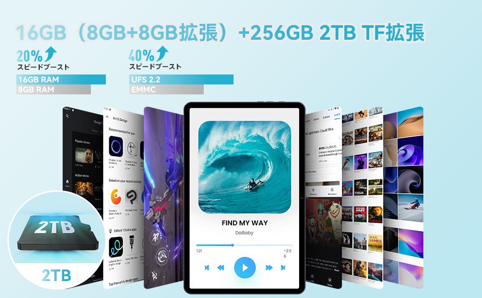 Hpad2 ProのRAMは8GBから16GBの仮想メモリまで拡張可能。8GB + 8GB仮想メモリのメモリ構造は、本体に8GBのランニングメモリを搭載し、ランニングメモリがいっぱいになると、ストレージメモリからインテリジェントに割り当てられるように設計されています。 8GBのサポートデバイスは、実行速度が20%向上し、システムはフリーズなしで実行されます。