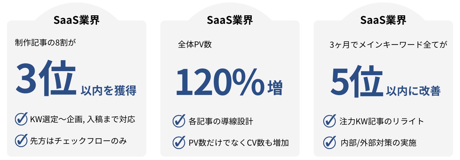 キーワード調査からターゲット設定、記事の企画構成などといったSEO 対策に必要な施策はすべて網羅しておりSEOによる集客強化、リード数の増加を実現します。