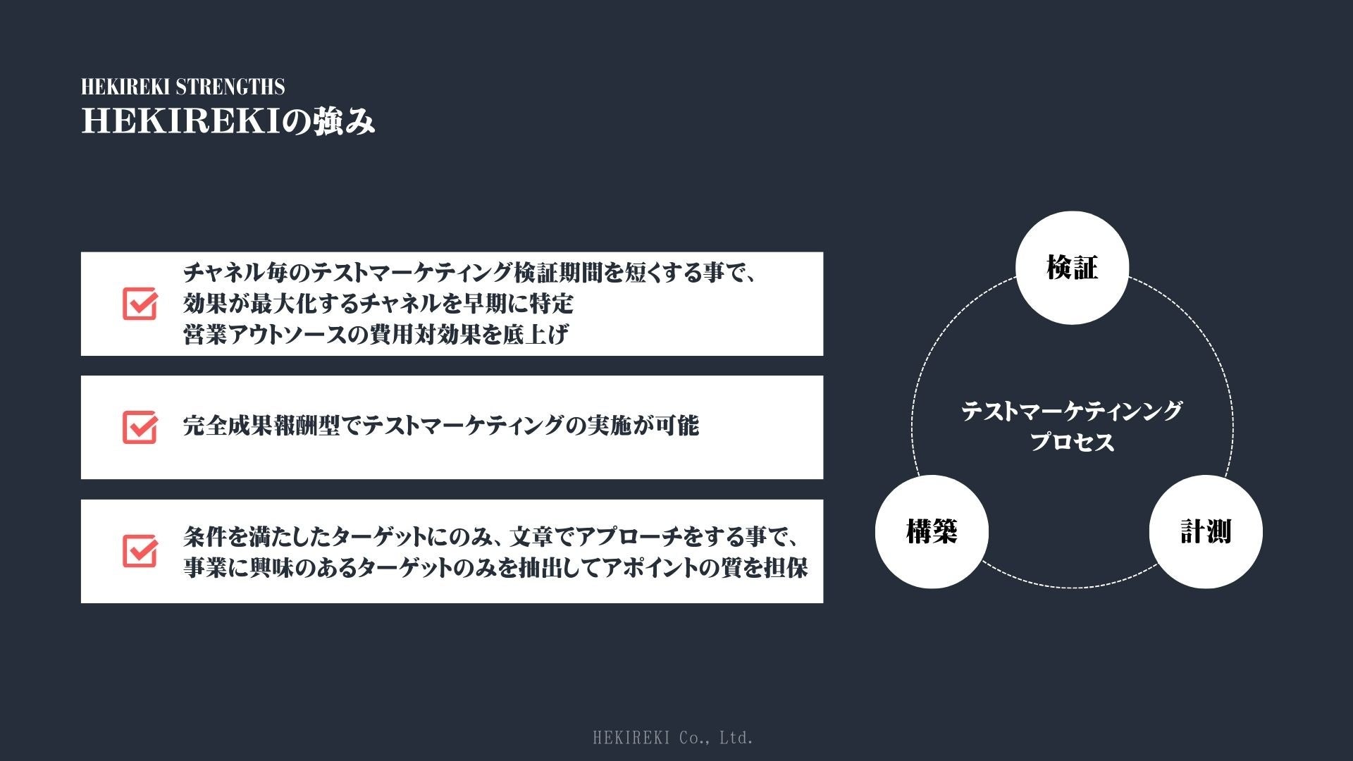 当社は創業当初より、スタートアップ企業やベンチャー企業における「新規開拓営業の課題をゼロにする」を念頭に事業活動を行ってきました。その中でも当社は新規営業における新規商談の創出に着目いたしました。昨今、BPO業界における営業代行やインサイドセールス代行会社は幾多とある中、クライアントに対して本当に満足いただける価値提供ができているサービスは少ないのではないかと我々は考えました。そこで当社は、成果報酬で決裁者のアポイントメントを獲得するHEKIREKIインサイドセールスをリリース、開始3ヶ月で50社のご支援に成功しました。