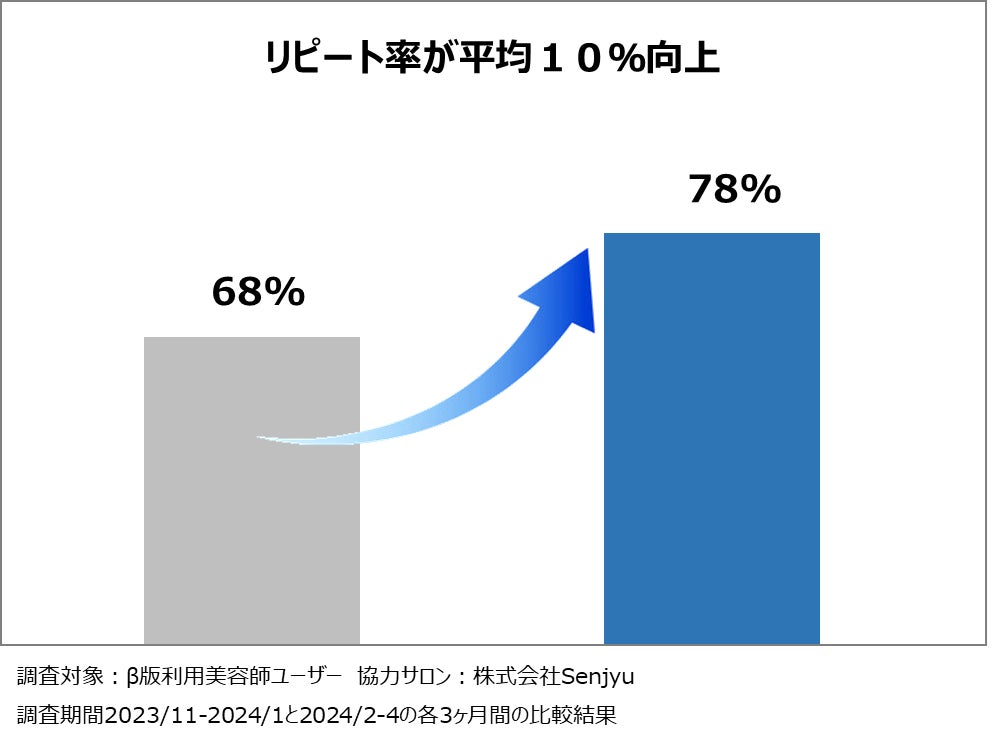 「i Producer」を活用する美容師において、平均して10%以上のリピート率向上が確認されました。美容院の課題であるリピート率向上において、重要な改善であり、AI技術の有効性を示唆しています。