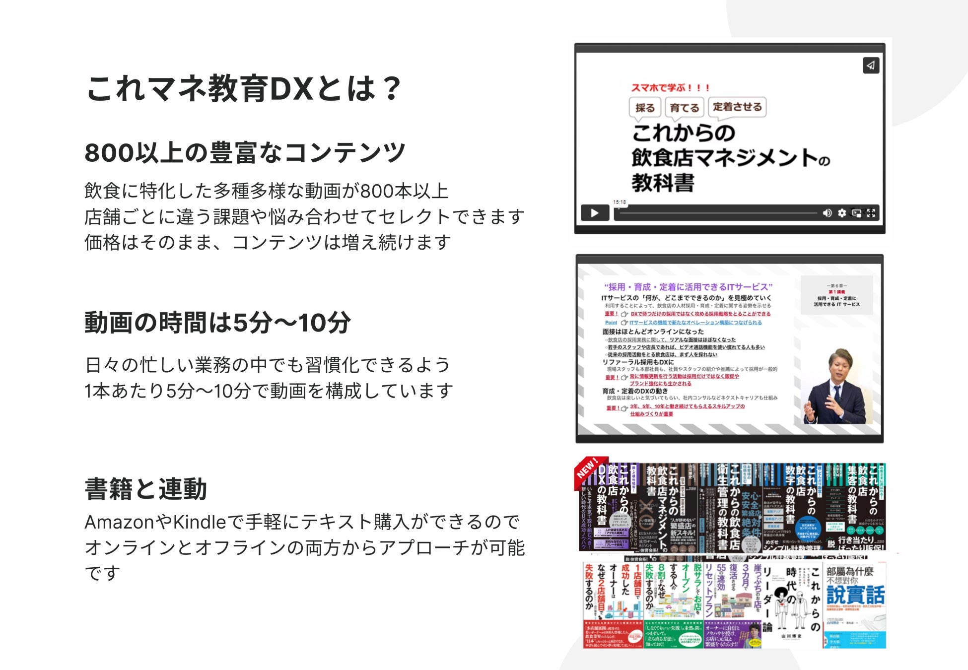 一般社団法人これからの時代の・飲食店マネジメント協会(略称:これマネ)は飲食店専門eラーニングプラットフォーム【これマネ教育DX】を教育事業者や飲食事業者へ提供しています。飲食に特化した多種多様な動画コンテンツを、現在約800本以上取り揃えているため、店舗ごとに違う課題や悩みに合わせた動画を提供し効率的なオンラインマネジメントの実現に取り組んでいます。