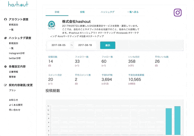 ビッグデータを活用したWEBサービス開発・運営を行う株式会社hashout(東京都豊島区、代表取締役:落合匠、以下当社)は、Twitter・Instagramにおけるハッシュタグ分析ツール「hashout (ハッシュアウト)」にアカウント分析とハッシュタグ過去データ取得を新たに搭載しました。