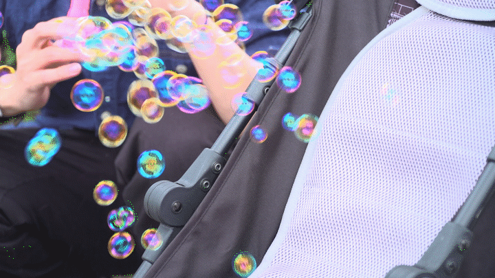 車ではチャイルドシート、屋外ではベビーカーに取り付け可能。