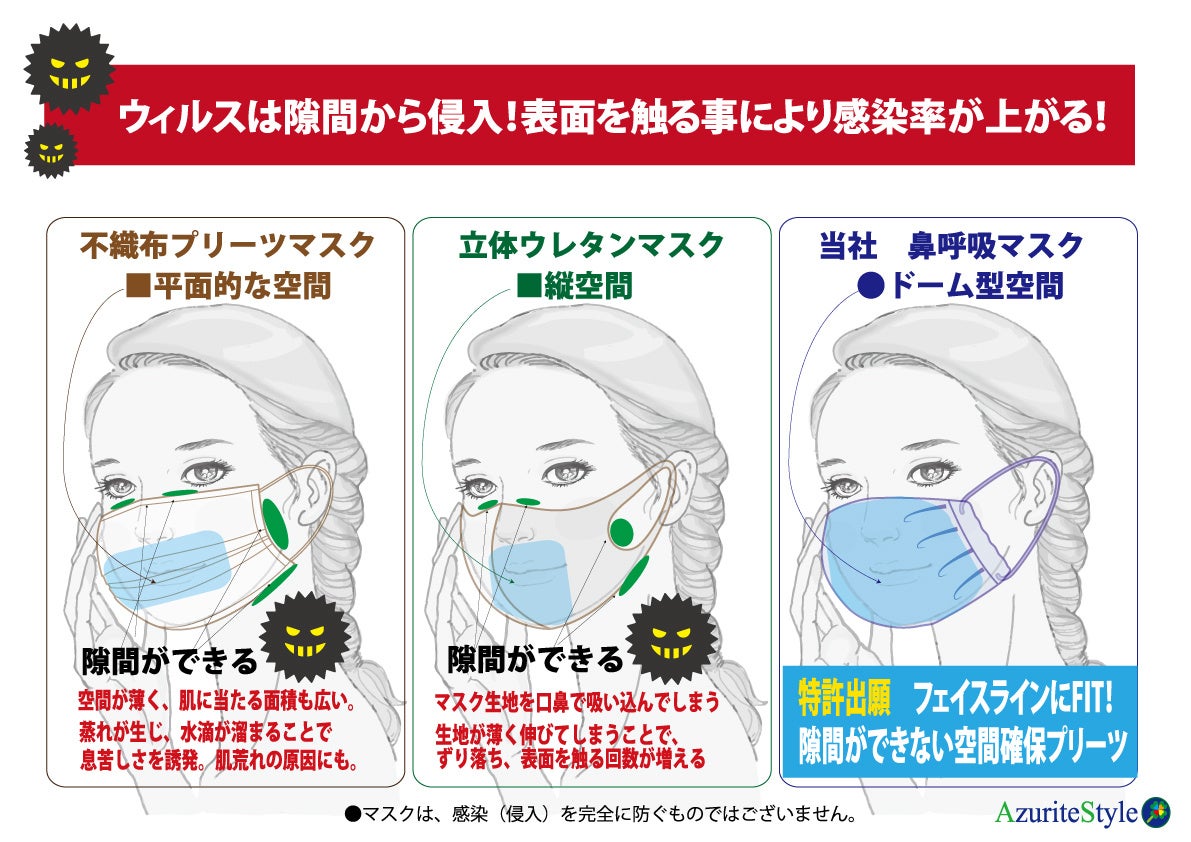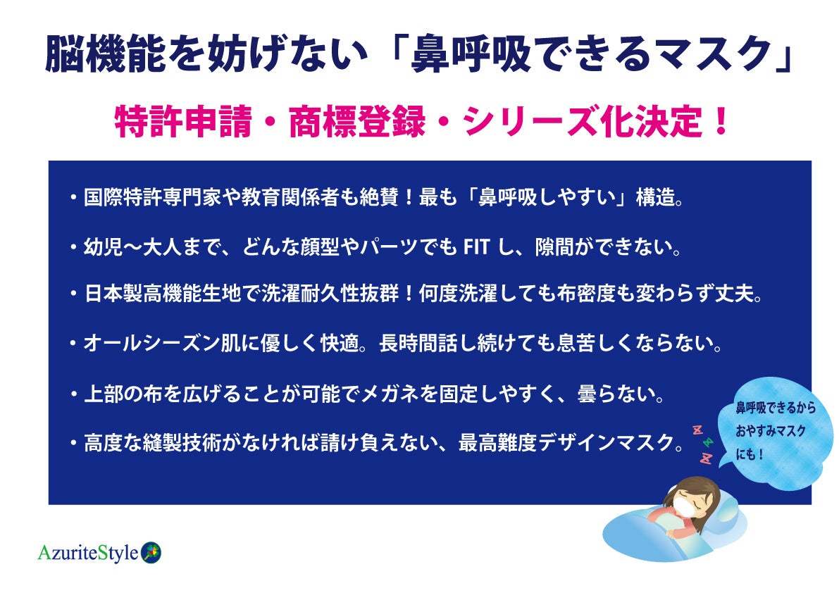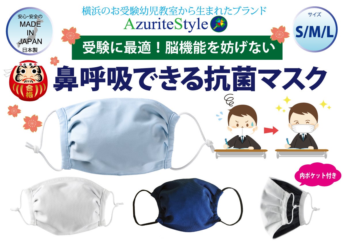 2020年6月発売以来、人気継続中の「鼻呼吸ができる抗菌マスク」シリーズ。横浜の受験教室アジュライト独自の空間確保プリーツデザインで特許申請・商標登録。「洗える不織布&抗菌ガーゼの受験生専用マスク」を限定販売!S.M.Lサイズ展開。