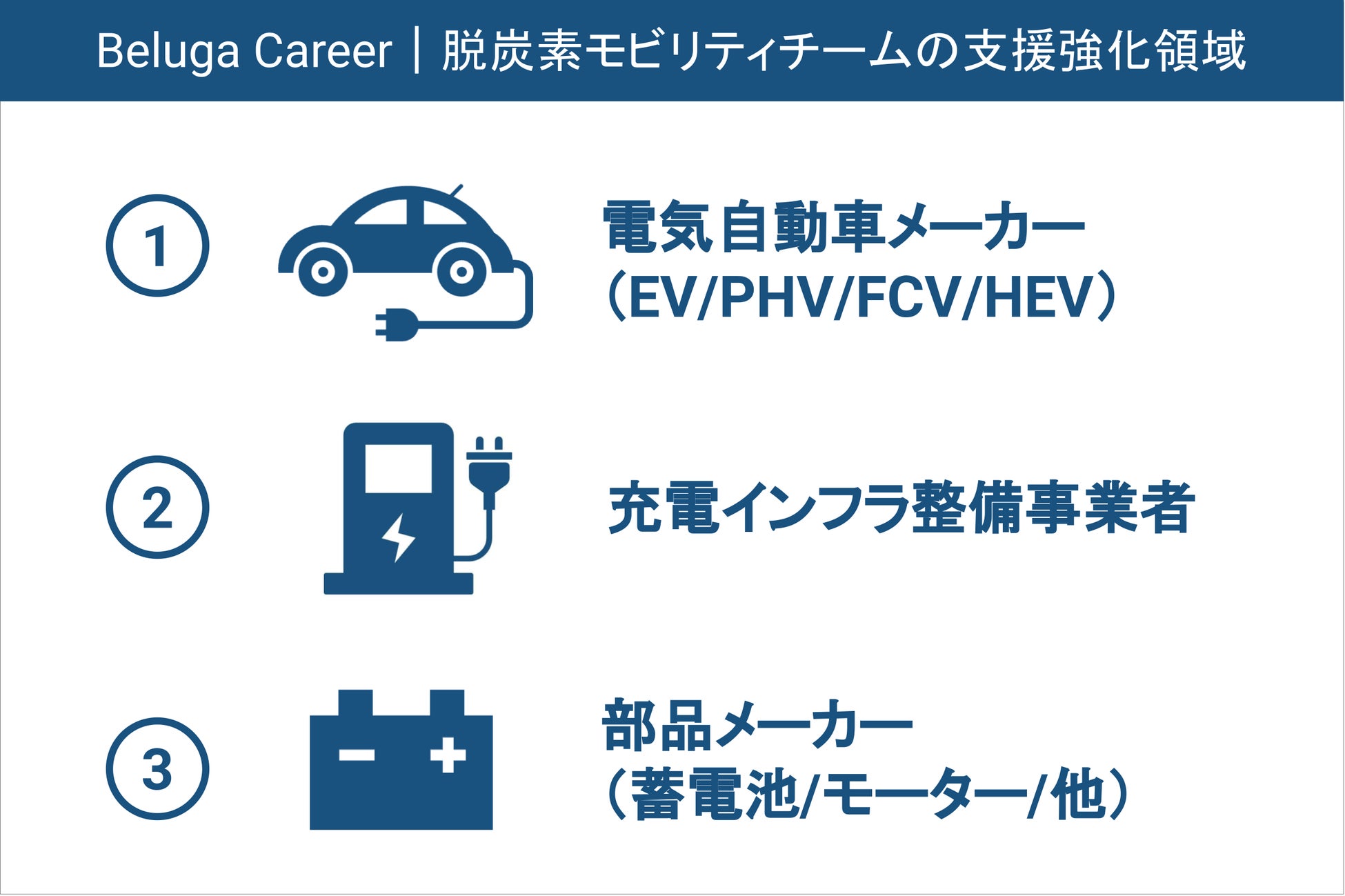 Beluga Careerサービスにおける脱炭素モビリティチームでは、これまでの弊社実績/候補者特性とモビリティ領域の動向を踏まえ、以下の3領域を主だった支援強化領域として事業を推進してまいります。