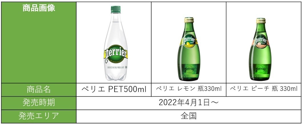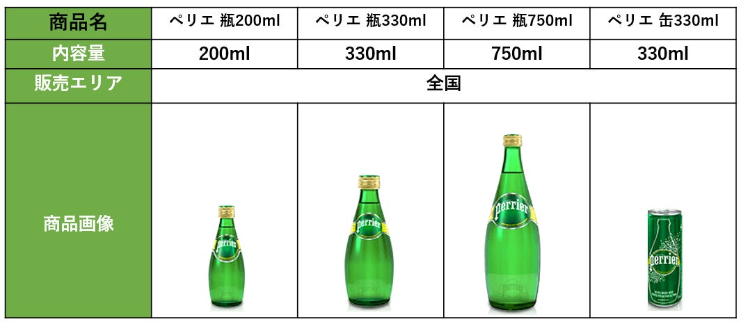 また、プレーンの「ペリエ」にフルーツエキスを加えて作った「ペリエ レモン瓶330ml」「ペリエ ピーチ瓶330ml」も同時発売いたします。
