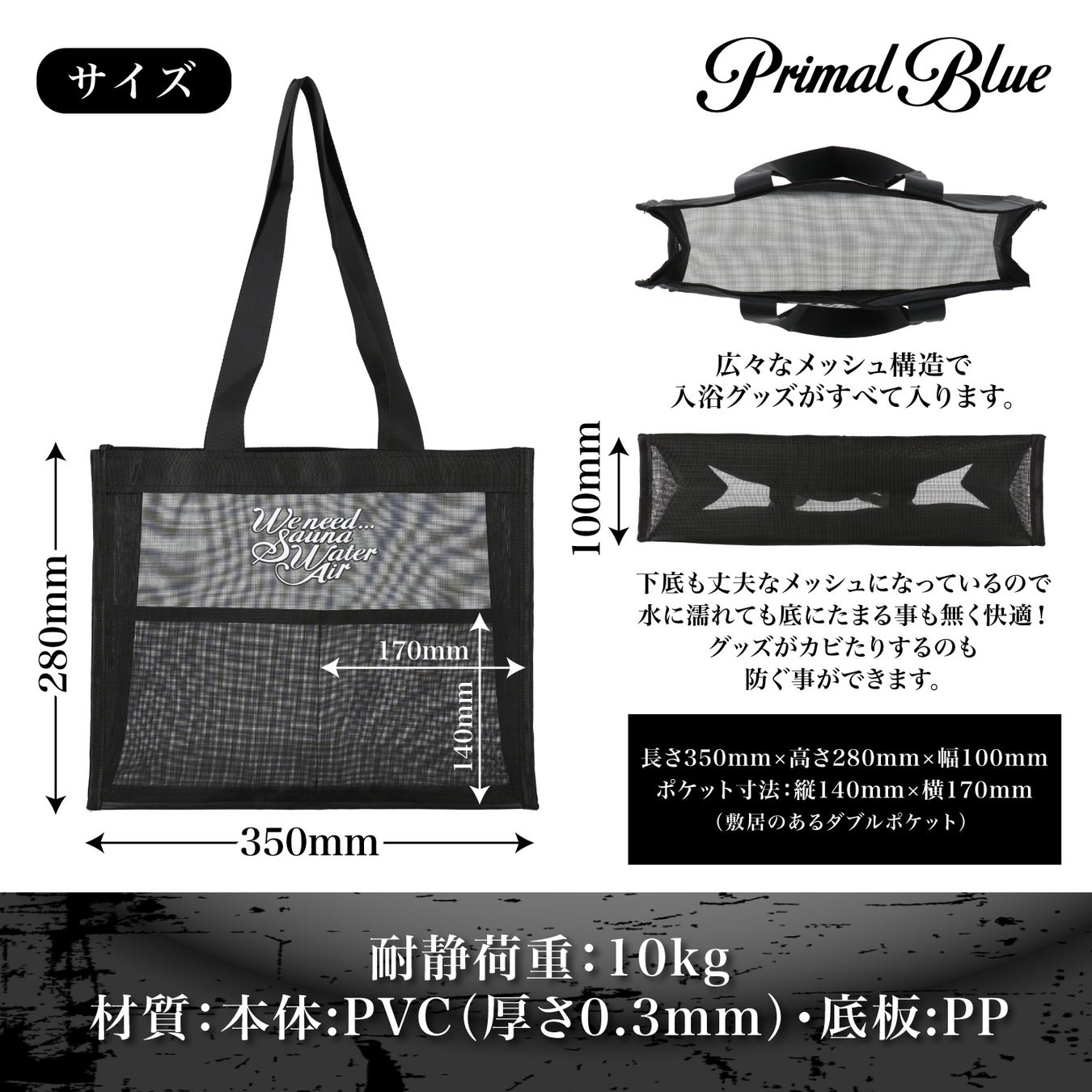 メッシュトートバッグなのでサウナ施設や銭湯など浴場に持って入って濡れても安心です。
