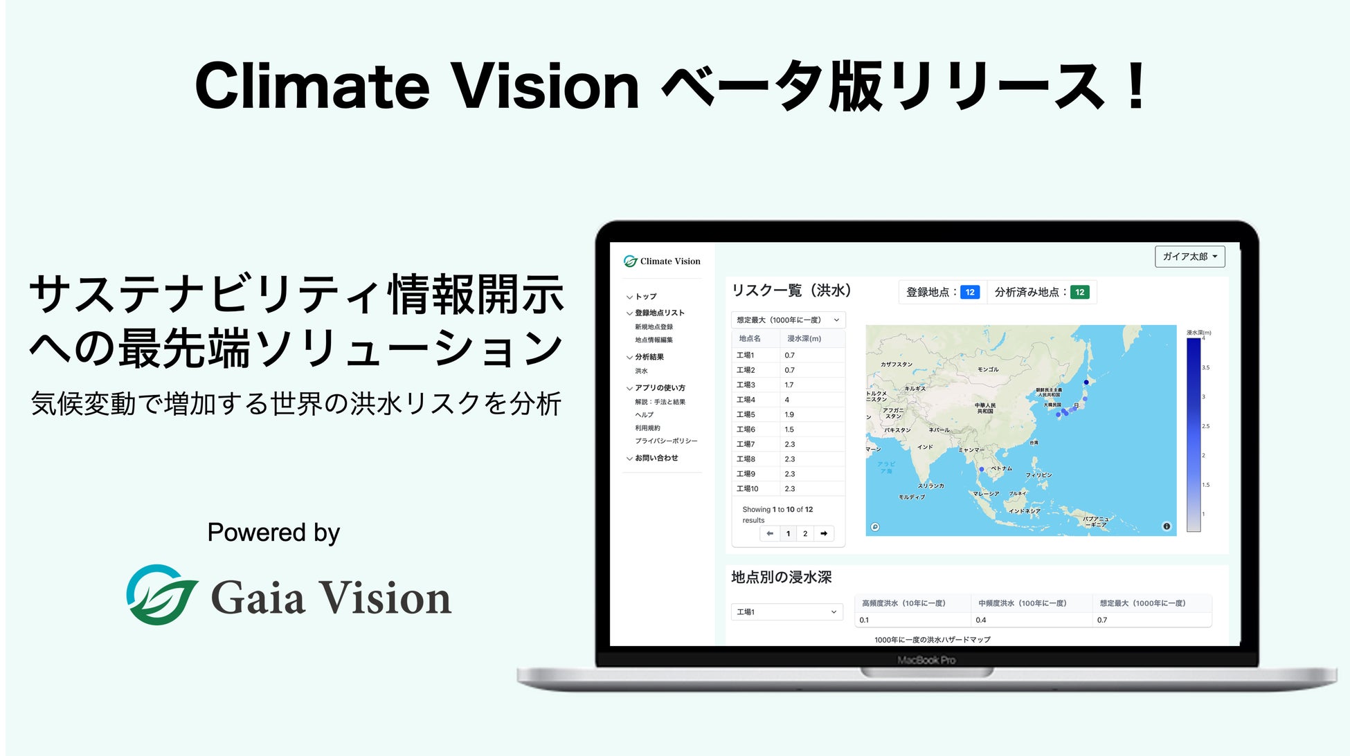 株式会社Gaia Vision(本社:東京都渋谷区、代表取締役:北祐樹)は、気候変動対応とサステナビリティ情報開示において求められている洪水リスクを簡単に分析できるWebアプリケーション「Climate Vision(クライメート・ビジョン)」のベータ版の提供を2022年8月1日より開始することをお知らせいたします。