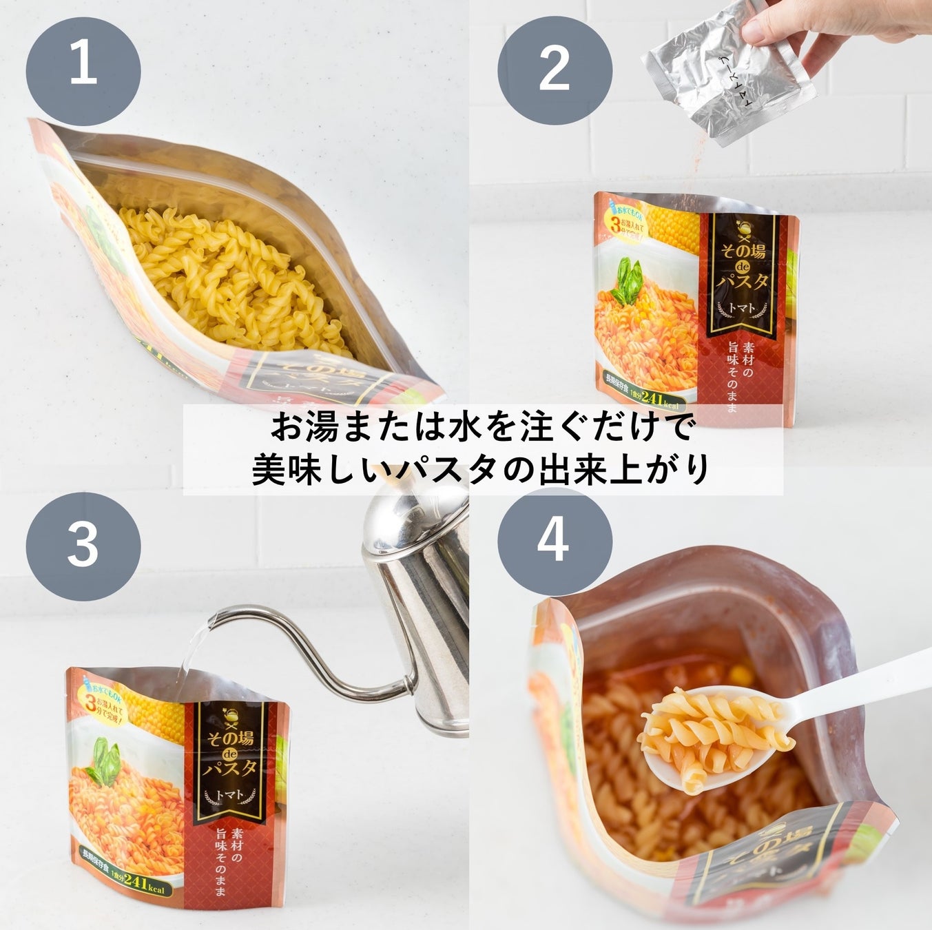 お湯を注いで3分で本格的な美味しいパスタが出来上がります。