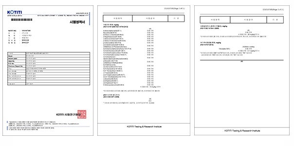 また、KOTITI試験研究院より、人体に有害な化学物質であるホルムアルデヒド、その他25種類の化学物質が検出されていない無毒性の認証を受けた安心素材です。
