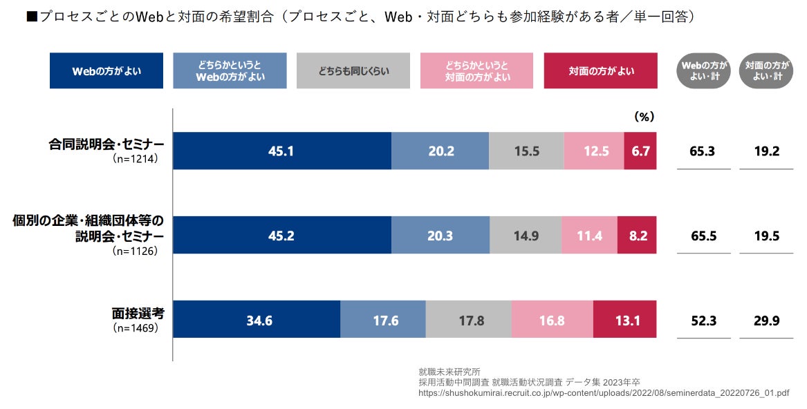2023年ごろにはオンラインを活用した就職活動が、従来の対面型のイベントと同様に主流なものとなり、学生からは、Webを活用した活動を希望する声が多い割合となっていました。