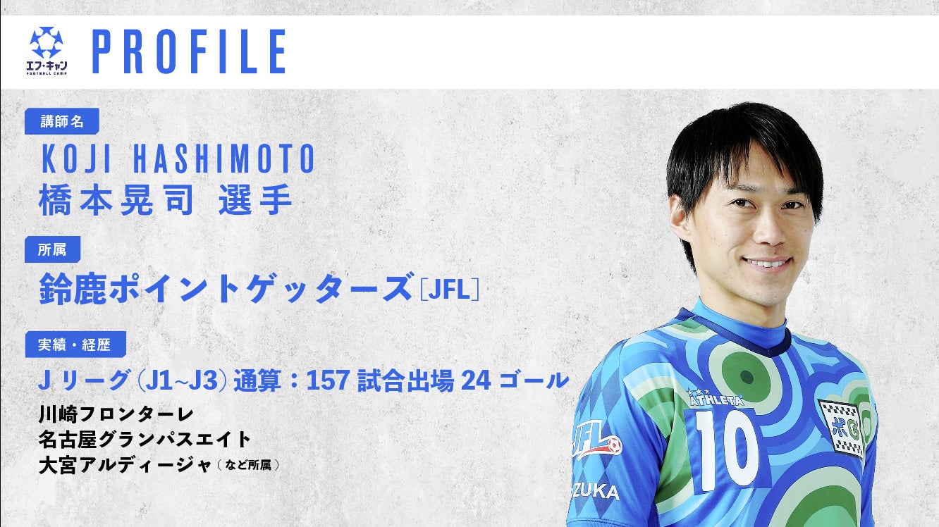 「今回、友人である武岡優斗氏の縁でエフ・キャンに参加させていただくことになりました。新たな挑戦となりますが、プロ生活含めこれまで培った経験、知識や技術を、サッカーに本気で取り組んでいる子供たち届けたいです。子供たちの成長のために全力で協力できればと思います。宜しくお願いします。」
