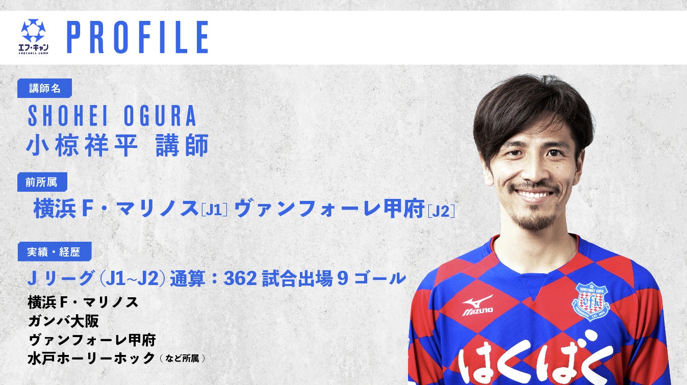 「小椋祥平です!オンラインでサッカーを教わるっていうことが、中々イメージできないかもしれませんが、オンラインだから伝えられることもたくさんあると思います。特に色々なプロ選手のサッカーに対する向き合い方、考え方を聞けるのはとても価値のあることだと思うので、そういったことも含めて子供たちに僕の経験や知識をたくさん伝えられたと思います!技術だけではなくサッカー脳も鍛えましょう!エフ・キャンで待ってます!!」