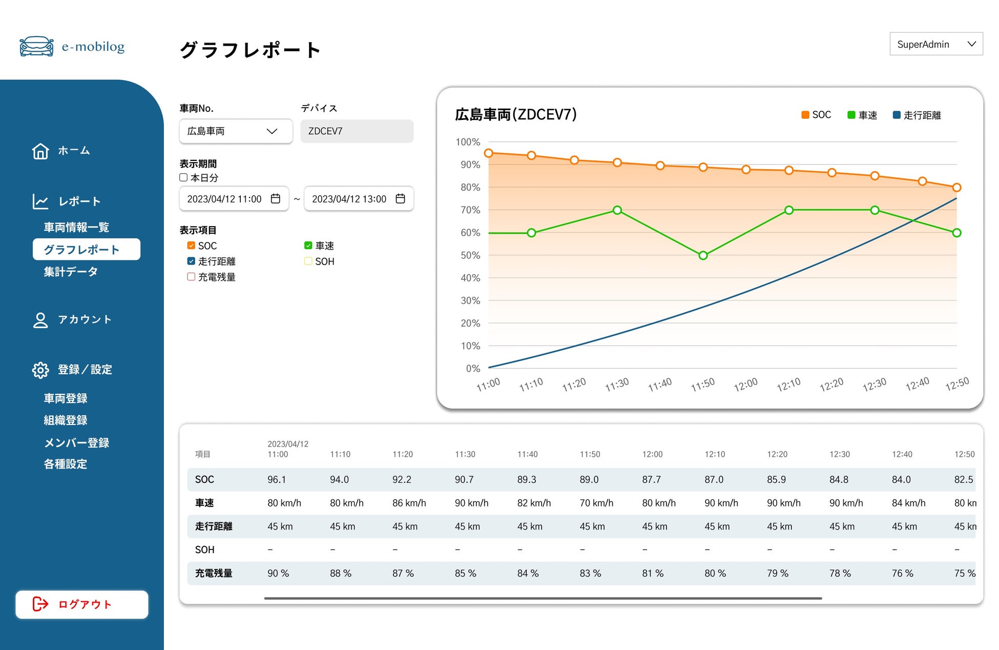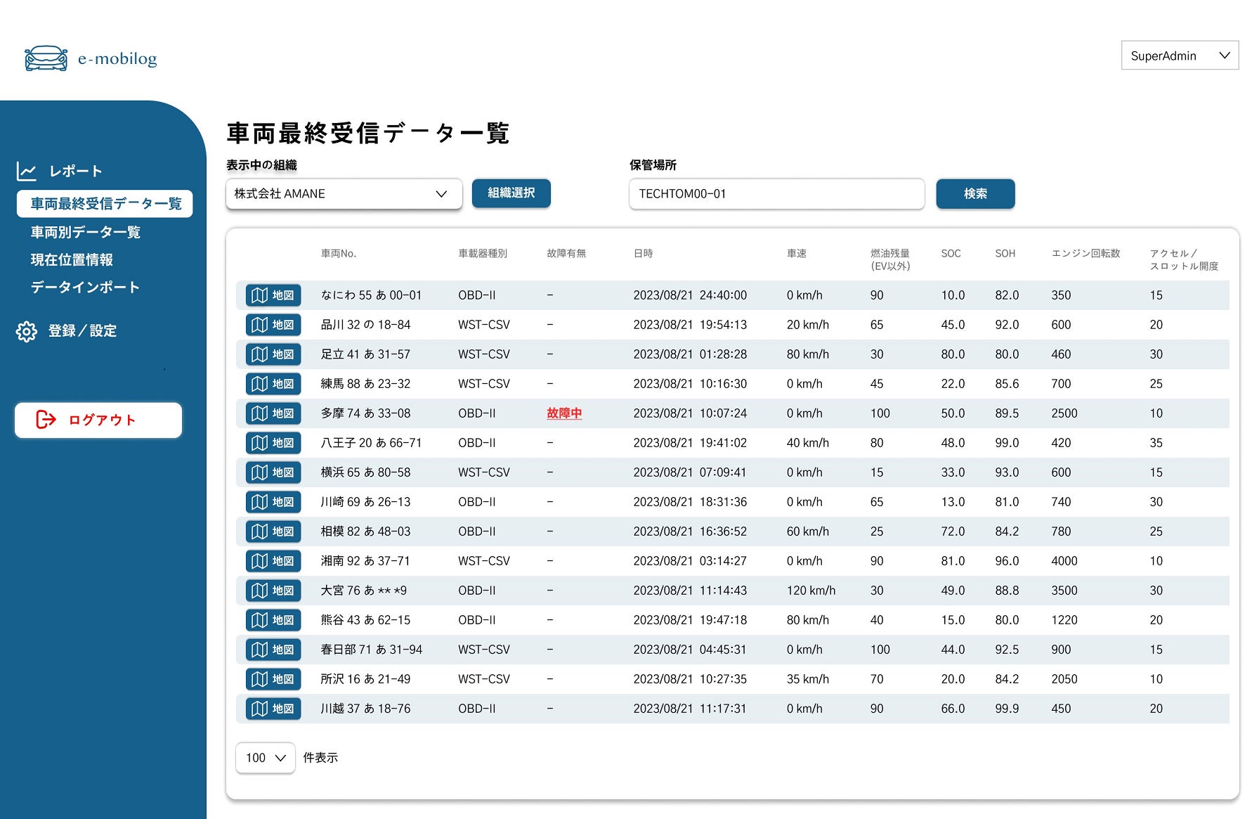 ・各種車両情報の表示:SOC、SOH(State of Health:バッテリー劣化度)、走行可能距離、稼働ステータス、充電状態、充電プラグ状態、故障データなど ※車両、デバイスにより取得出来るデータは異なります。