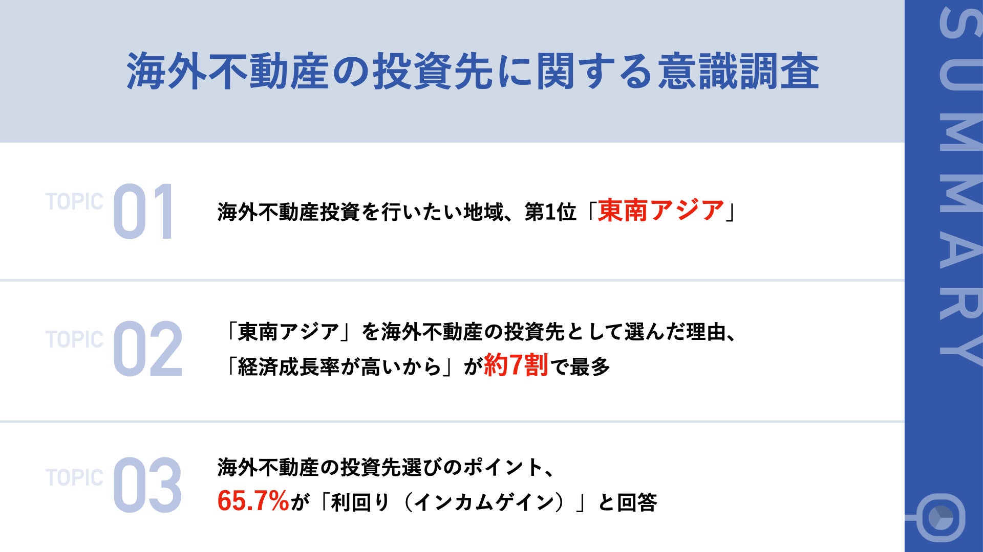 今回の調査では、「東南アジア」に魅力を感じている投資家が多いことや、海外不動産の投資先選びのポイントとして、利回りを重視しているということが明らかになりました。日本に比べ、高い利回りや節税効果があることなどから人気が高まっている海外不動産投資。日本の少子高齢化や、不動産投資の市場が飽和状態にあることなど、さまざまな理由から投資家に注目されているようです。一方で、海外の不動産であるからこそ情報を集めるのが難しいことや、為替リスクなどもつきまとうため、今後の海外不動産投資のトレンドや方向性を掴むために、海外不動産投資経験者の情報を参考にしてみてはいかがでしょうか。