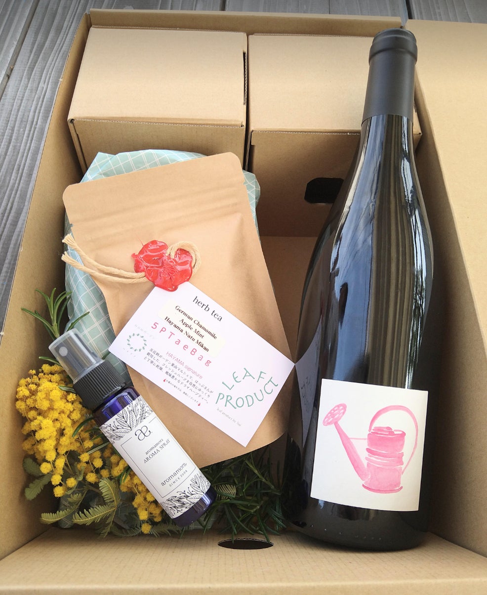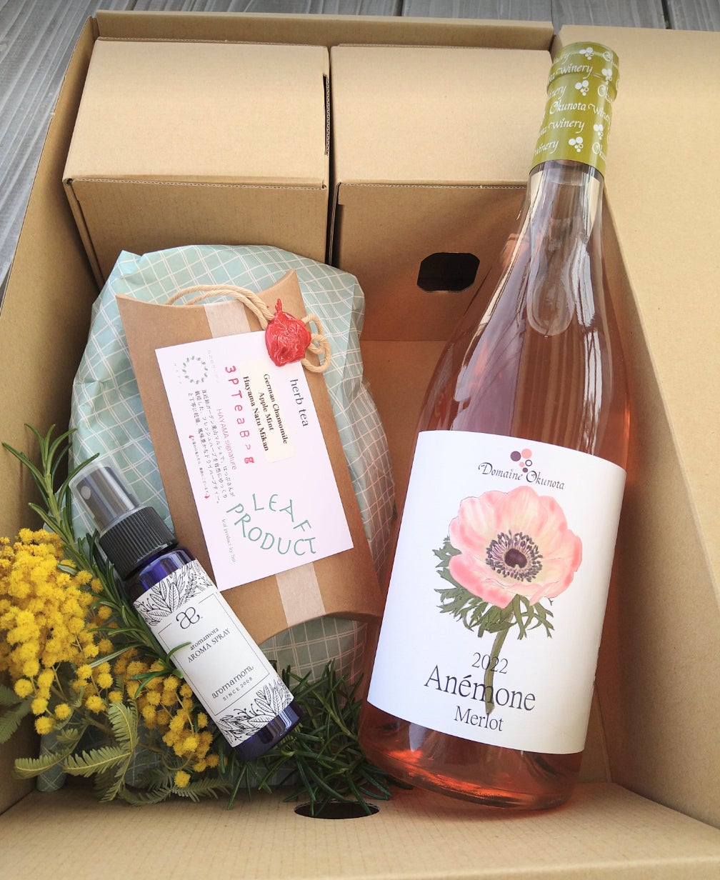 本企画のきっかけは、代表の鬼無が葉山のコーヒースタンドで飲んだハーブティです。香りと力強い味わいに感動したハーブティは、大橋マキさん主催の「はっぷ」のハーブから作られたものでした。大橋マキさん手作りの「Mother」という名のアロマオイルスプレーがあることもわかり、「母の日に、香りを楽しむワインと共に贈りたい」とお願いをし、本企画が実現いたしました。お母さんたちに、香りを楽しめる、アロマオイルスプレーとハーブティ、香り豊かなバラ色のロゼワインをセットにいたしました(ノンアルコールのセットもございます)。