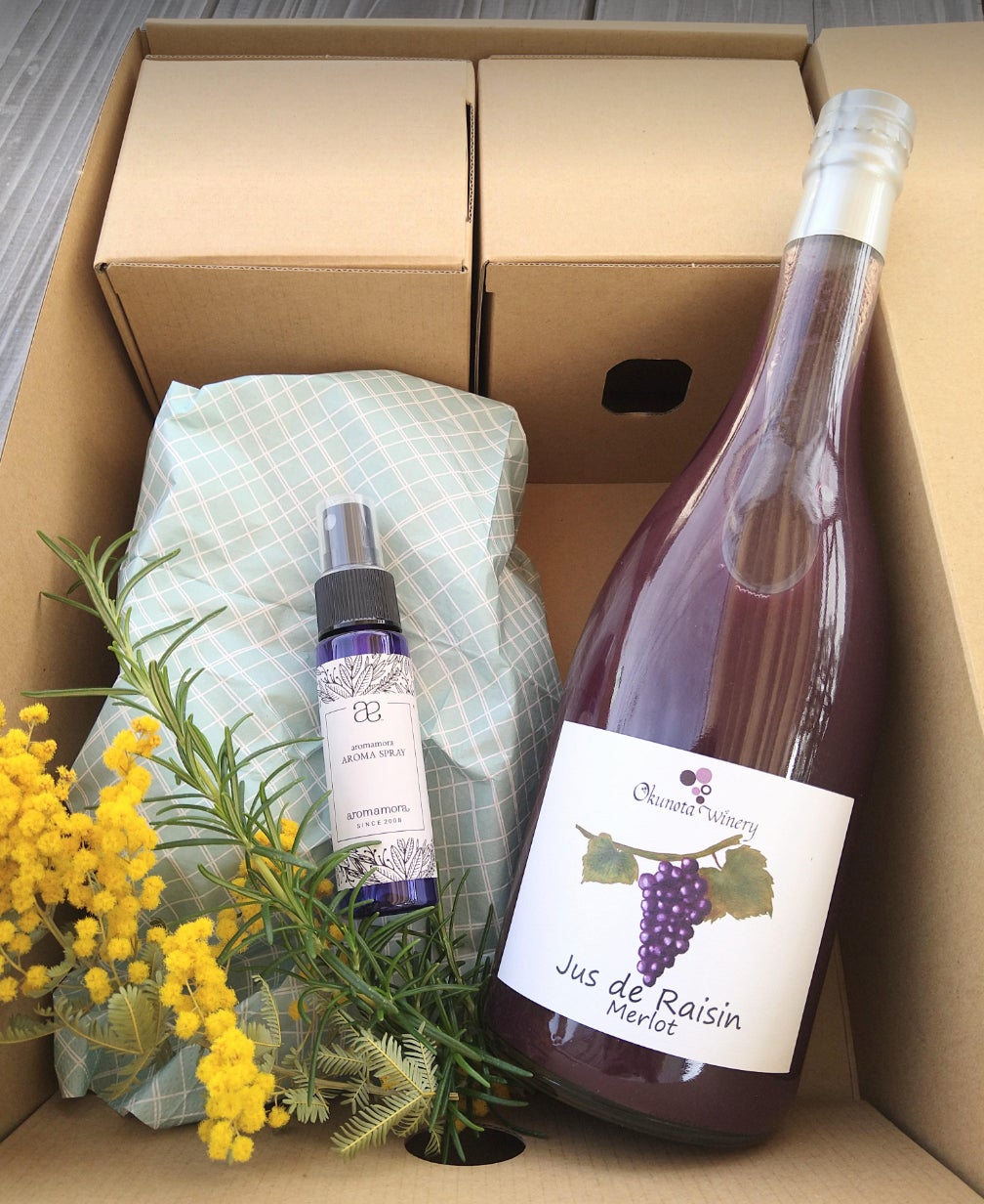 母の日ギフト3種類。ワインとアロマオイルスプレーの他に、プレミアム葡萄ジュースやハーブティのセットもある