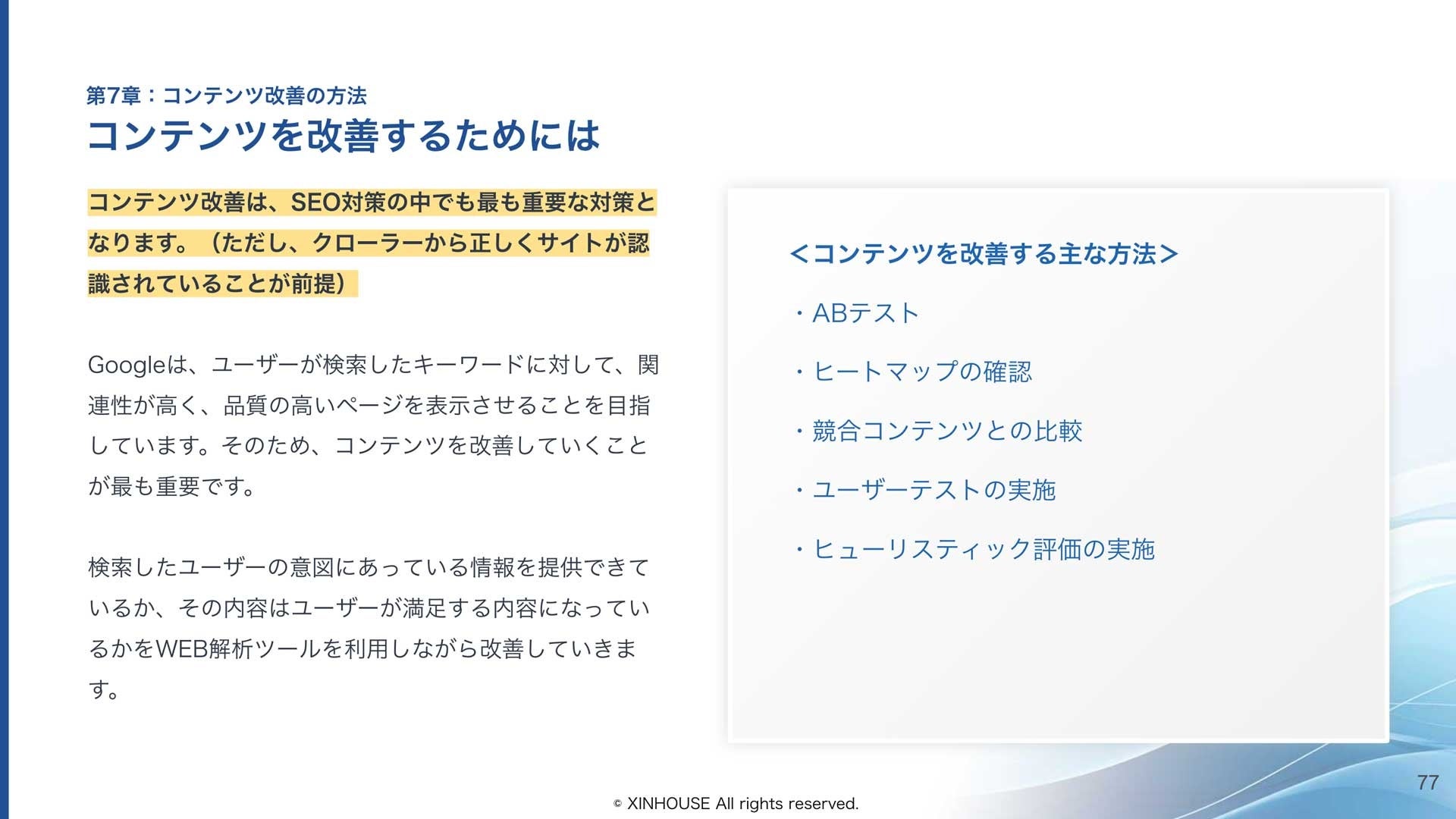 検索エンジンの仕組みから、SEO対策の流れ、テクニカルSEOのチェック方法、コンテンツのチェック方法、よくある質問まで、SEOに関するノウハウを幅広く監修しています。