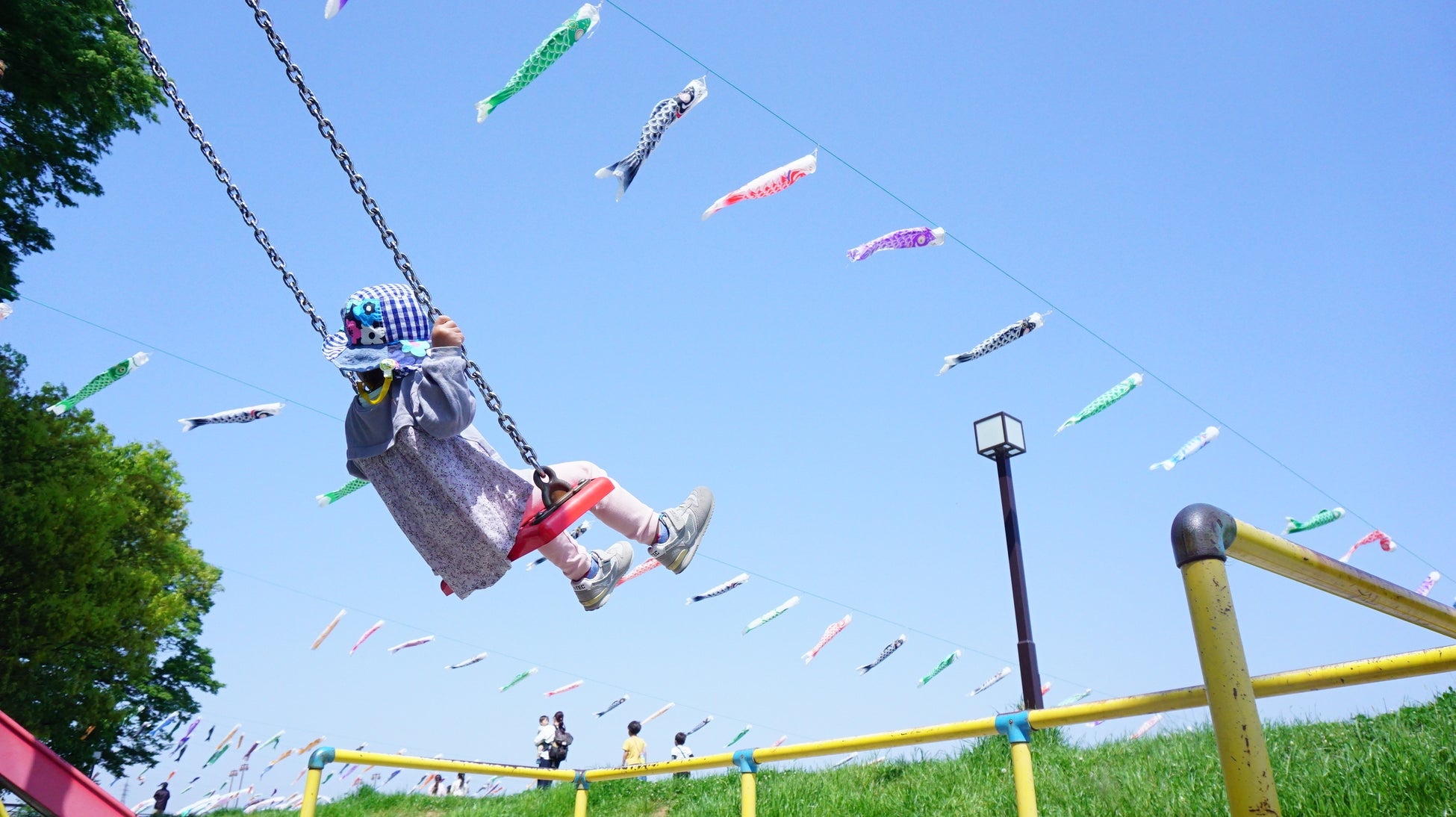 土手沿いの遊具の近くで撮影をしていると、自分たちが描いたこいのぼりを見に保育所の子供たちが先生と一緒に来ました。すぐに遊具が保育園児でいっぱいになっていたので、子供にとっては「こいのぼりよりも遊具」だったようです。そんな微笑ましい光景も今年は5月6日まで見られます。