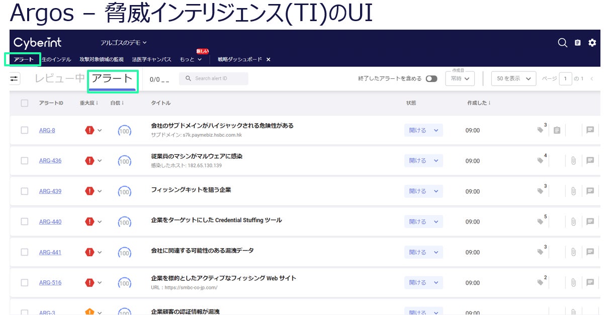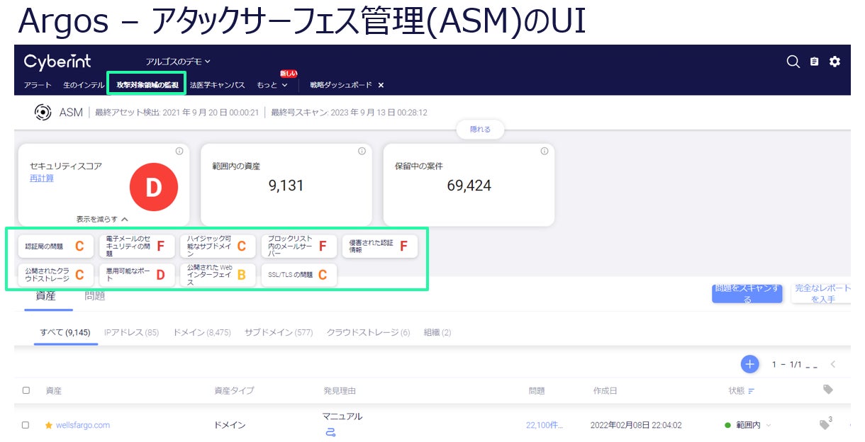 アタックサーフェス管理と脅威インテリジェンスを単一のプラットフォームで提供するサイバーイントのアルゴス プラットフォームのユーザーインターフェースの一部 :