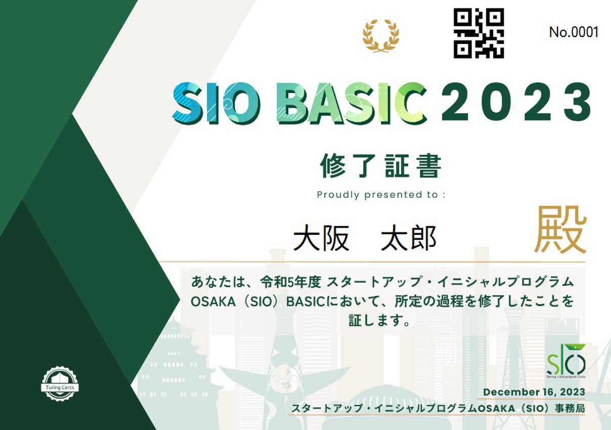 大阪産業局では、大阪府と連携し、起業準備中の方からシード期の起業家を対象に実施している、スタートアップ・イニシャルプログラムOSAKA(SIO)において、修了証にご活用いただくことで参加者へ達成感を与えプログラム終了後のフォローアップをサポートするとともに、参加者管理にもお役立ていただいています。以上のようにスタートアップとの連携を強化されたり、地域特化型の人材育成プログラムなどを開催されている地方自治体の皆様は是非開催されているイベントやプログラムにご活用ください。