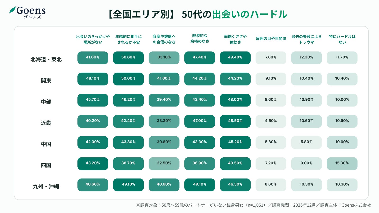 一方で、その寂しさを埋めるための「熱量」と「行動」には、住んでいる地域によって大きな差(偏差値)があることも判明しています。本調査では、7つのエリア別に算出した「50代の恋愛偏差値」とともに、地域ごとに異なる大人の恋愛事情と、その背景にある「本当の理由」を紐解きます。