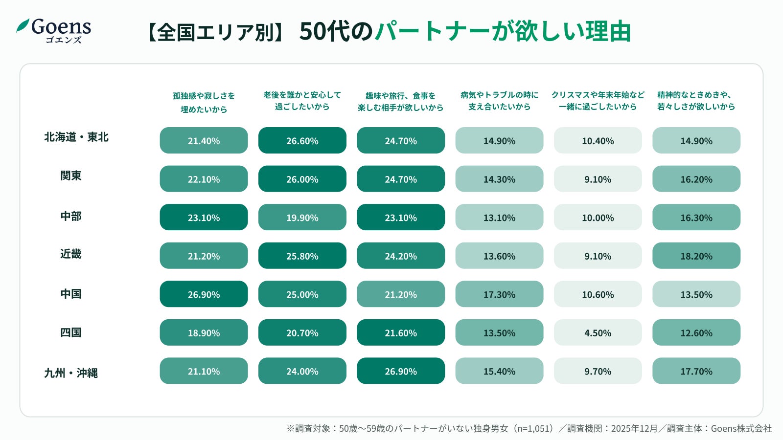 パートナー欲求の最大の理由は「老後の安心」。エリア別では「北海道・東北エリア」が最も高く、冬の寒さが厳しい地域ほど将来への不安を共有できる相手を求める傾向にある。