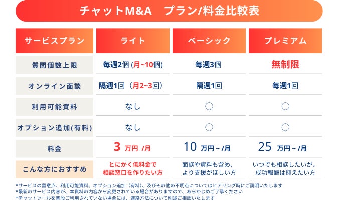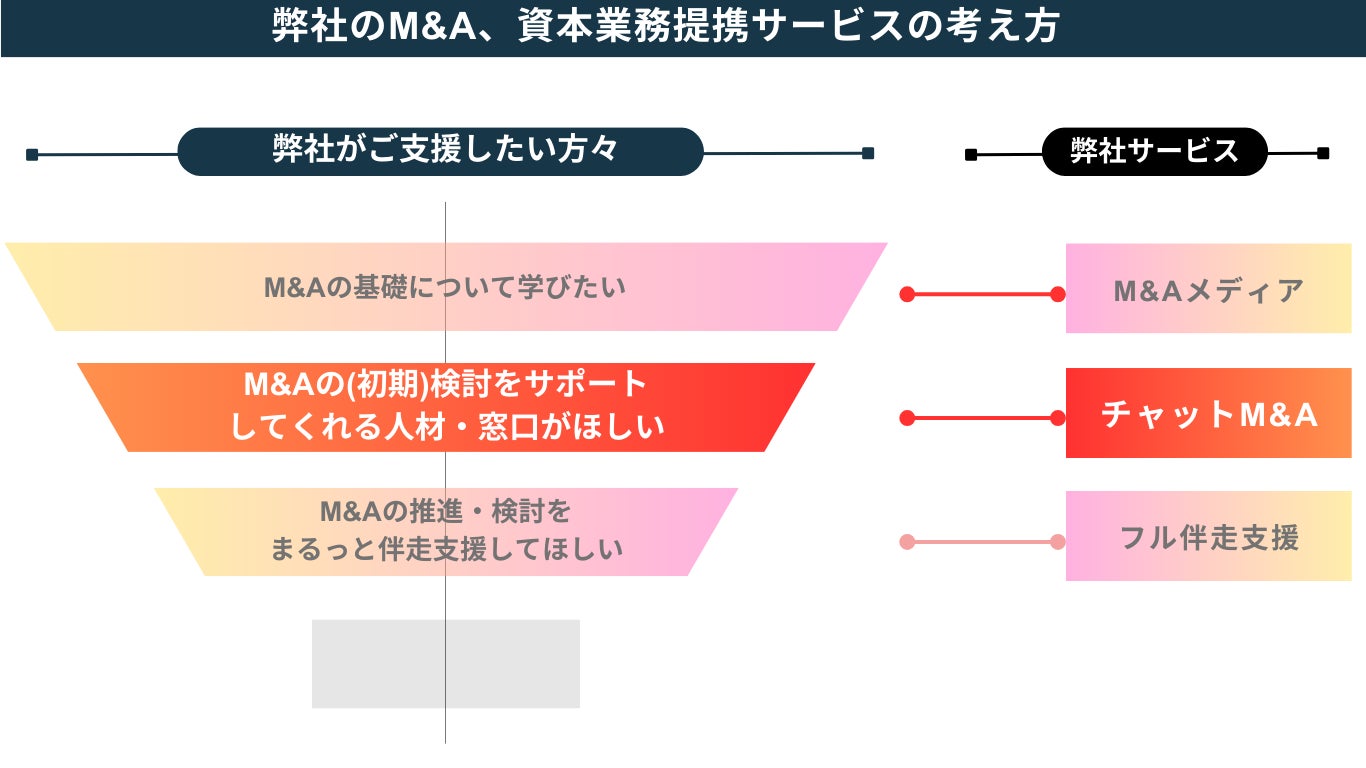 無料のメディアから、チャットM&Aサービス、本格的なM&A・資本業務提携のフル伴走支援まで、お気軽にご相談ください。 |