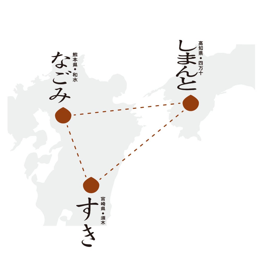 全国各地に栗の産地はいくつもあれど、育っている地域の背景も伝えるブランド栗は一体いくつあるだろうか。今回の企画の発端には「しまんと地栗」の存在があります。これまで様々な商品を世に送り出してきましたが、生産量の減少や農家の後継者不足など課題は尽きません。このように、他の栗産地でも同じように想いを抱える仲間がいるのではないか。そんななか巡り合ったのが、宮崎県小林市須木(すき)地区と、熊本県玉名郡和水(なごみ)町の2つの栗産地。「すき」「なごみ」「しまんと」の運命的な出会いにより、栗でつながる「ジグリフレンズ」が2022年1月17日に発売となりました。