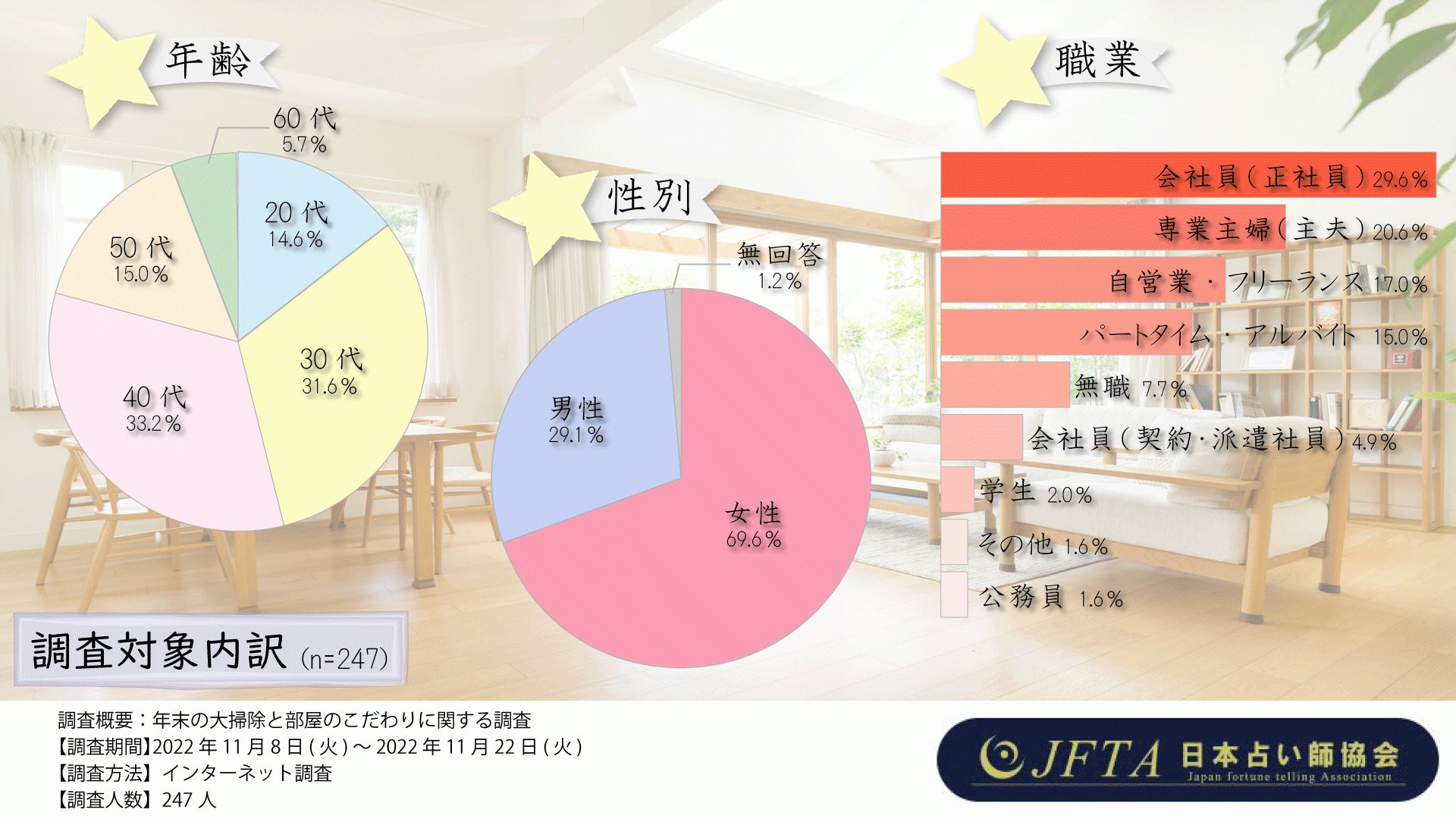 日本占い師協会(本社所在地:東京都中央区)は20代~60代の男女を対象に「年末の大掃除と部屋のこだわり」についての調査を実施しました。