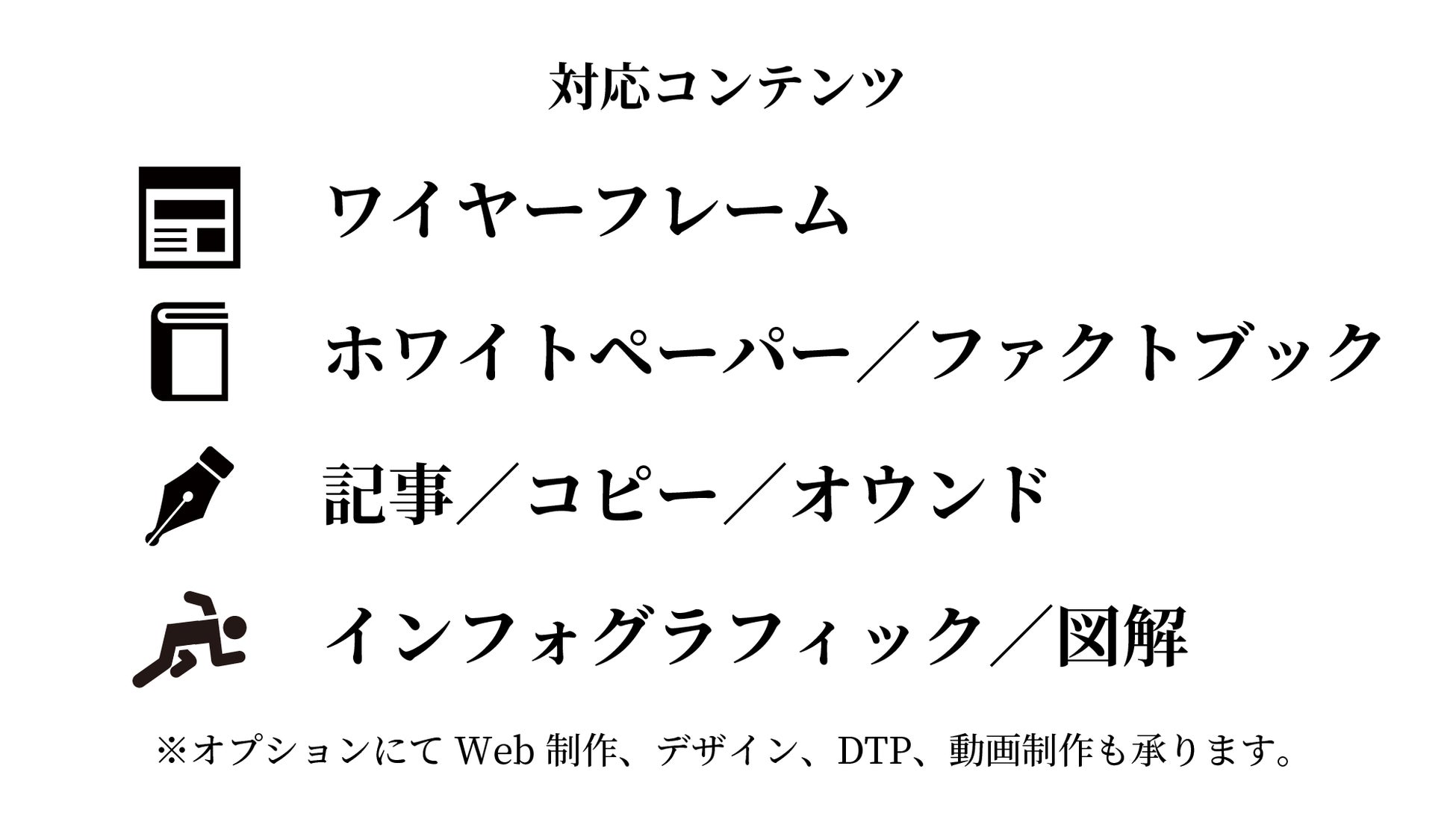 ワイヤーフレーム、ホワイトペーパー、ファクトブック、記事/コピー、インフォグラフィックなどお任せください。