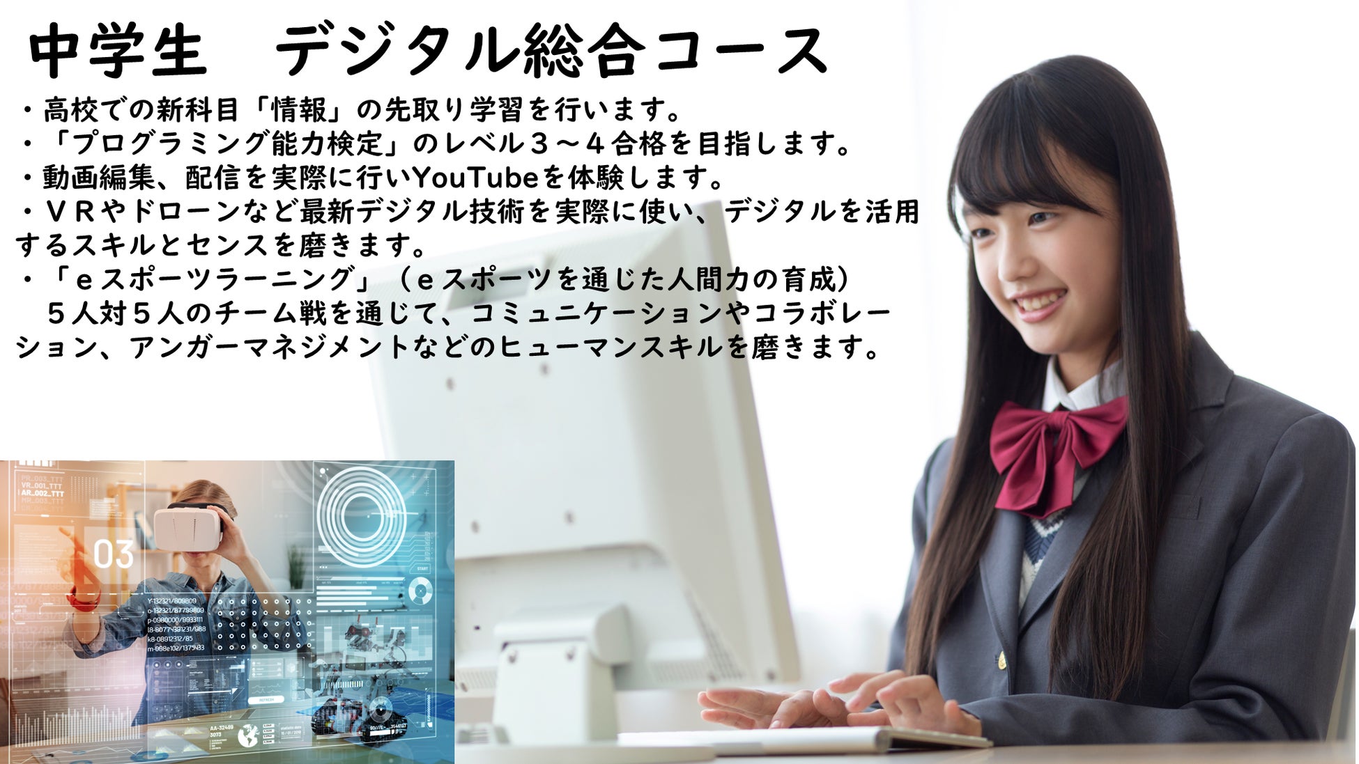 ・英数国理社の標準科目に加えて、「プログラミング」「eスポーツラーニング」などデジタルやプログラミングを学ぶコースもあります。デジタル技術を使いこなしてAIやロボットに仕事を奪われない人材を目指そう。